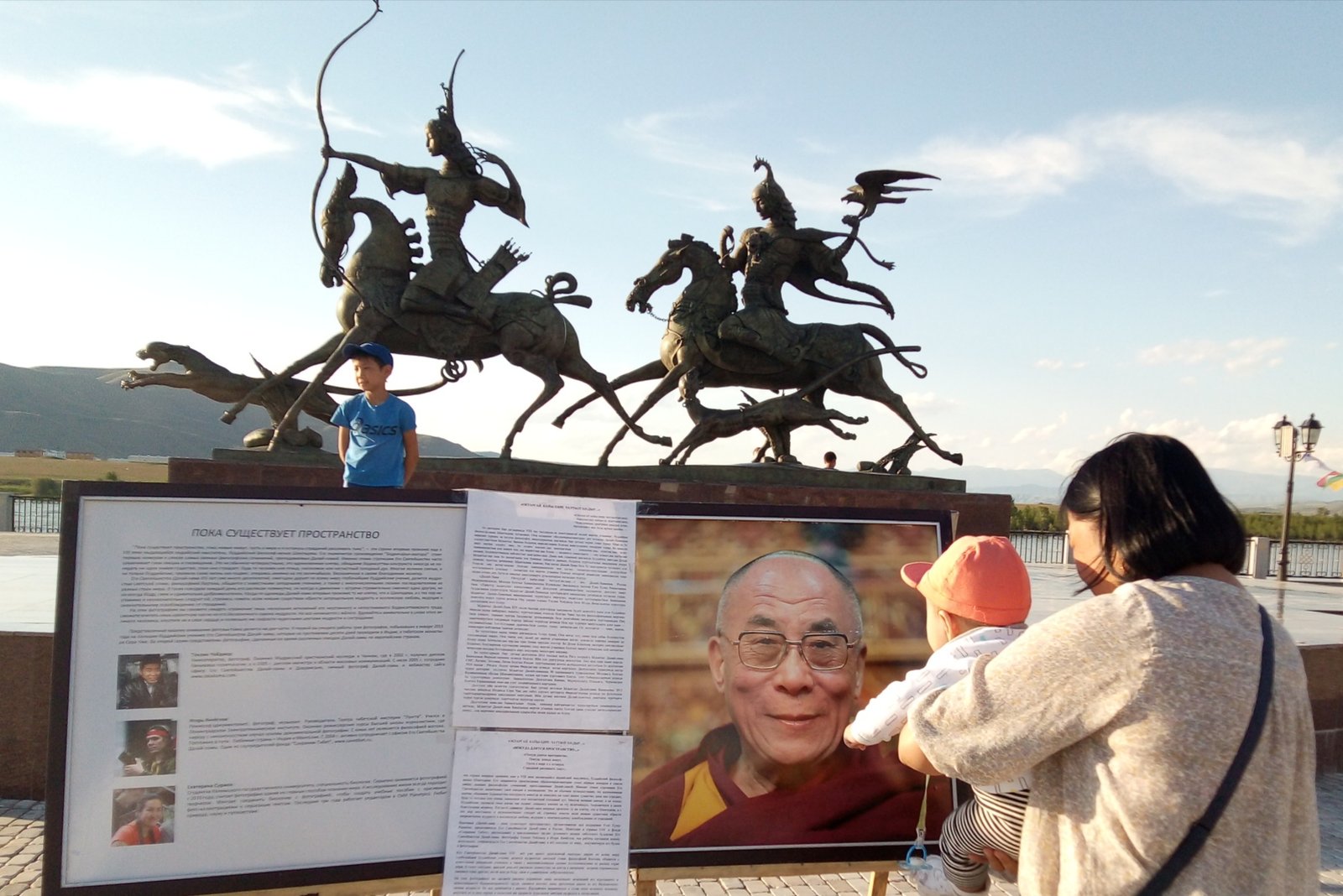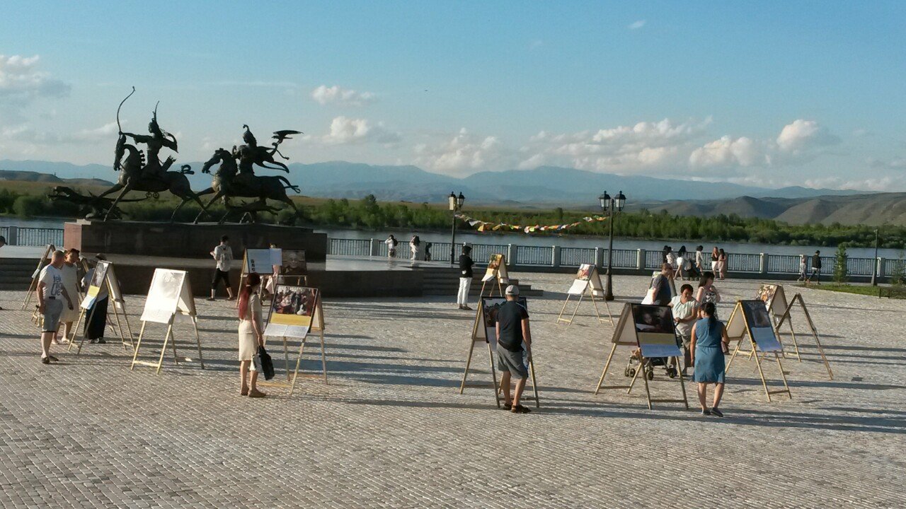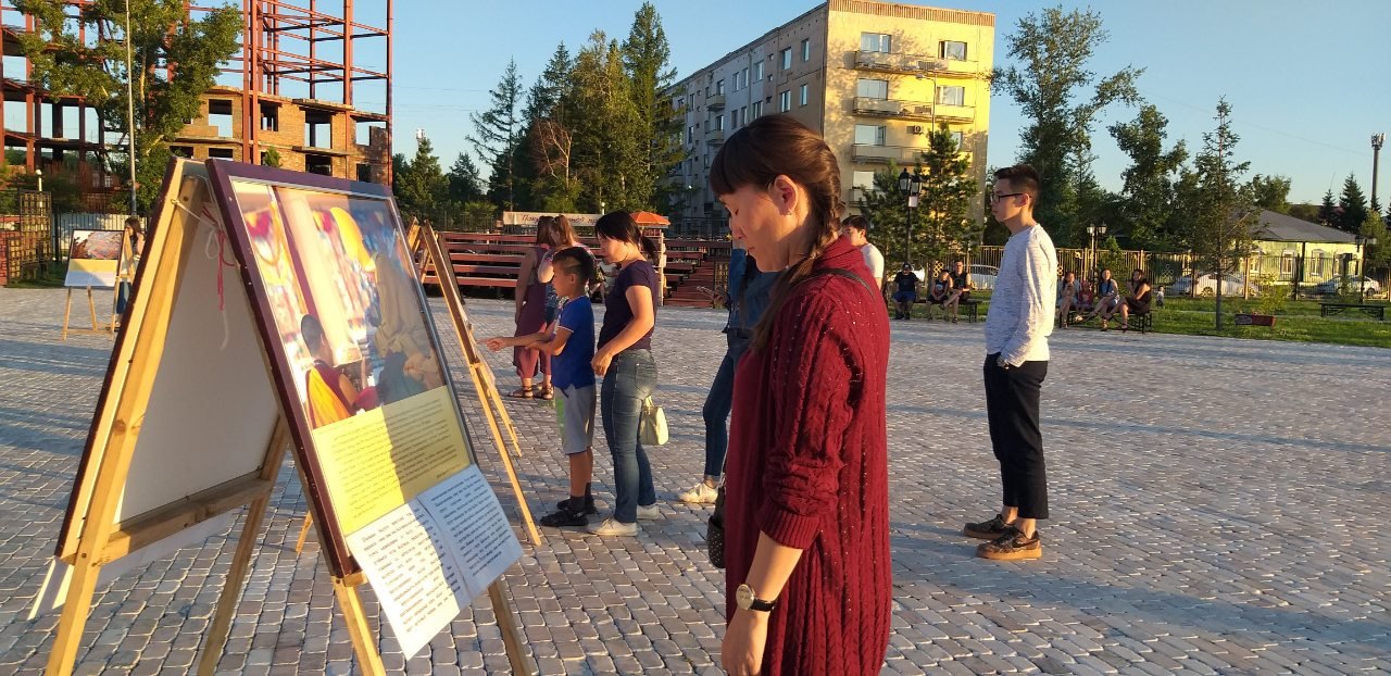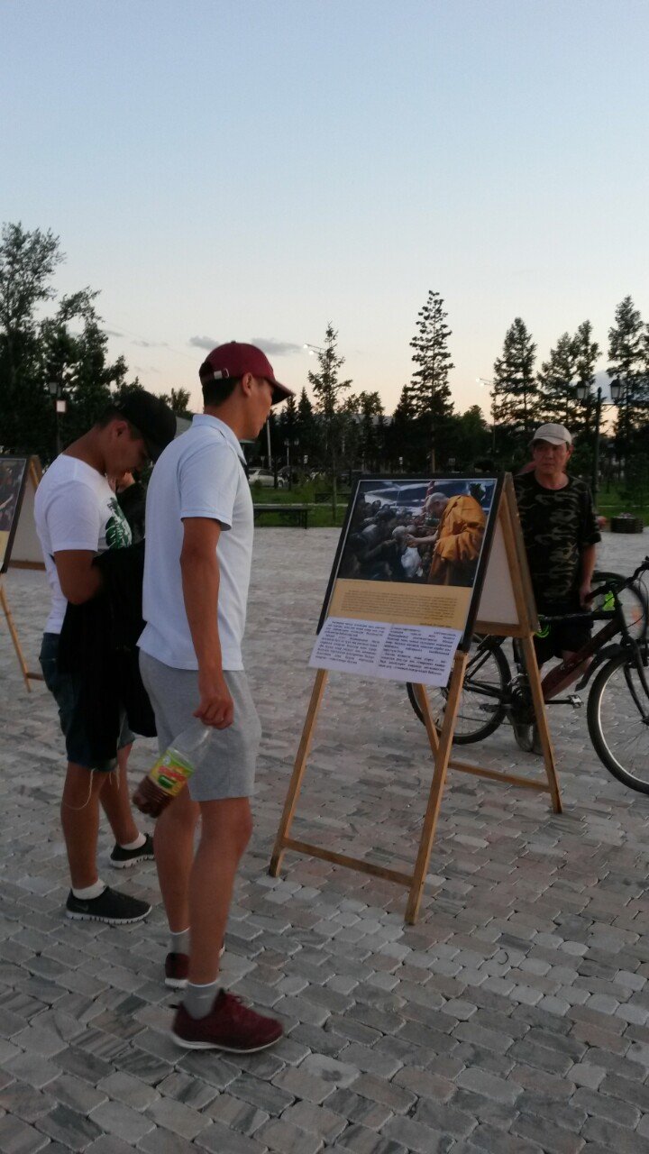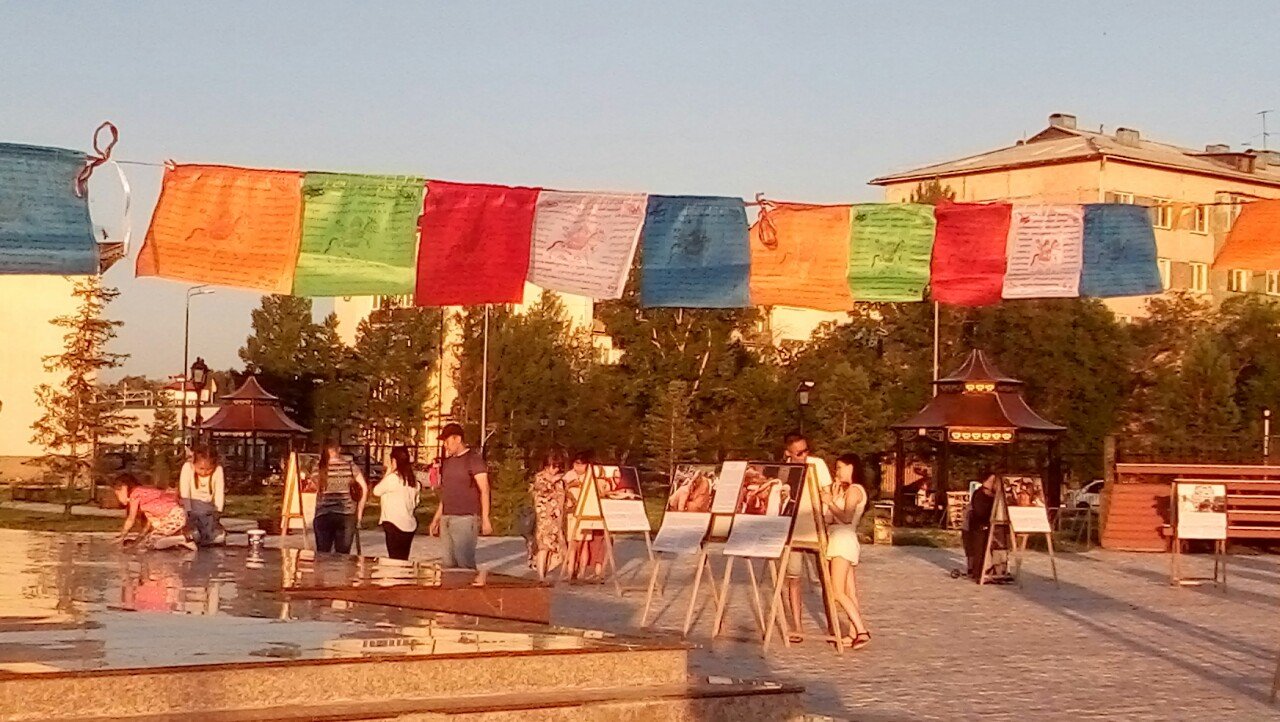 В особенном для тувинцев месте – на площадке амфитеатра знаменитого скульптурного комплекса «Центр Азии» в Кызыле – также царила праздничная атмосфера. На набережной Енисея открылась выставка красочных фотографий Его Святейшества. Каждое изображение ласкало взор живой улыбкой Учителя или несло его послание в виде цитат и советов для повседневной жизни. Слова Его Святейшества были переведены на тувинский язык, и посетители отметили, что на родном языке цитаты звучат для них более проникновенно.