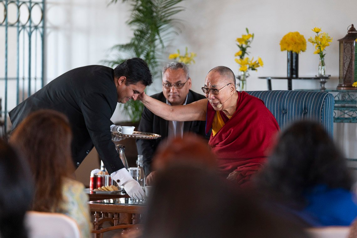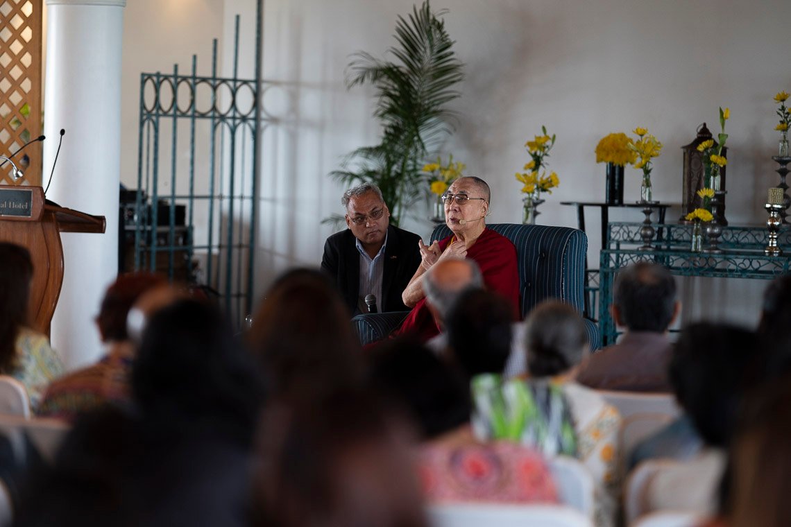 Нью-Дели, Индия, 21 сентября 2019 г. – Сегодня утром, беседуя с группой примерно ста представителей интеллектуальных профессий, преподавателей высших учебных заведений и дипломатов, Его Святейшество Далай-лама сказал, что как люди мы все одинаковы и с точки зрения устройства ума, эмоций и тела между нами нет абсолютно никаких различий. Все мы обладаем одинаковым мозгом и с рождения наделены одинаковым интеллектом. Более того, все мы хотим счастья и не желаем страданий.