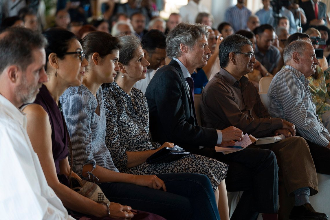 Когда пришел черед вопросов из зала, речь зашла об отношениях между Индией и Китаем, и Его Святейшество сказал, что этим двум странам подобает жить в атмосфере добрососедства и взаимопонимания. Поинтересовались, что лучше – приобщать детей к религии или прививать им общечеловеческие ценности. Его Святейшество ответил, что религиозная практика – это дело личного выбора, но элементарная душевная теплота идет на пользу всем без исключения.