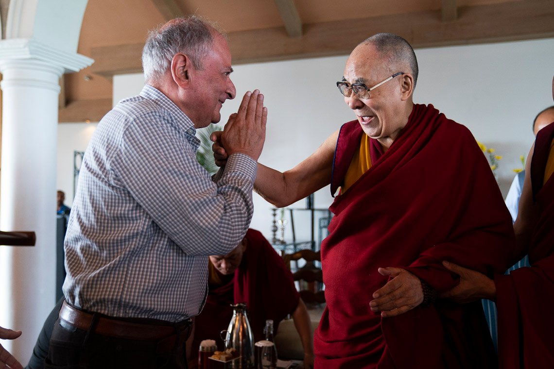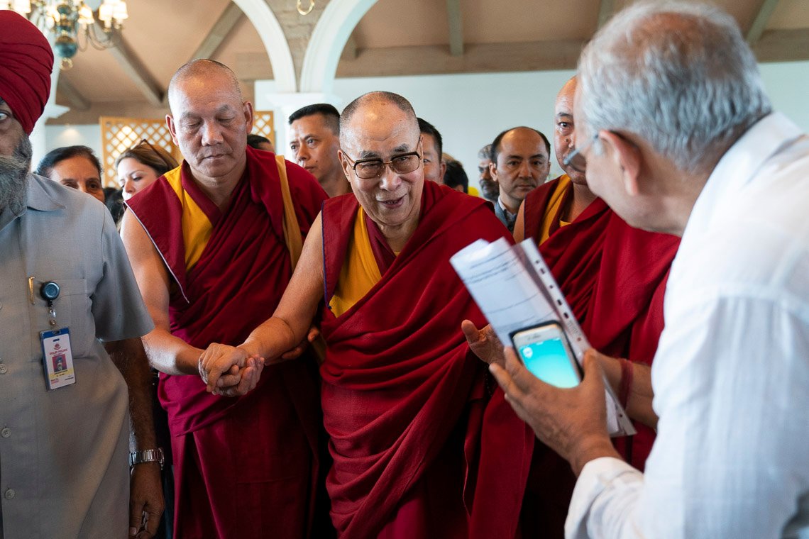 Перед началом встречи с группой интеллектуалов, профессоров и дипломатов Его Святейшество Далай-лама приветствует одну из участниц. Фото: Тензин Чойджор (офис ЕСДЛ).