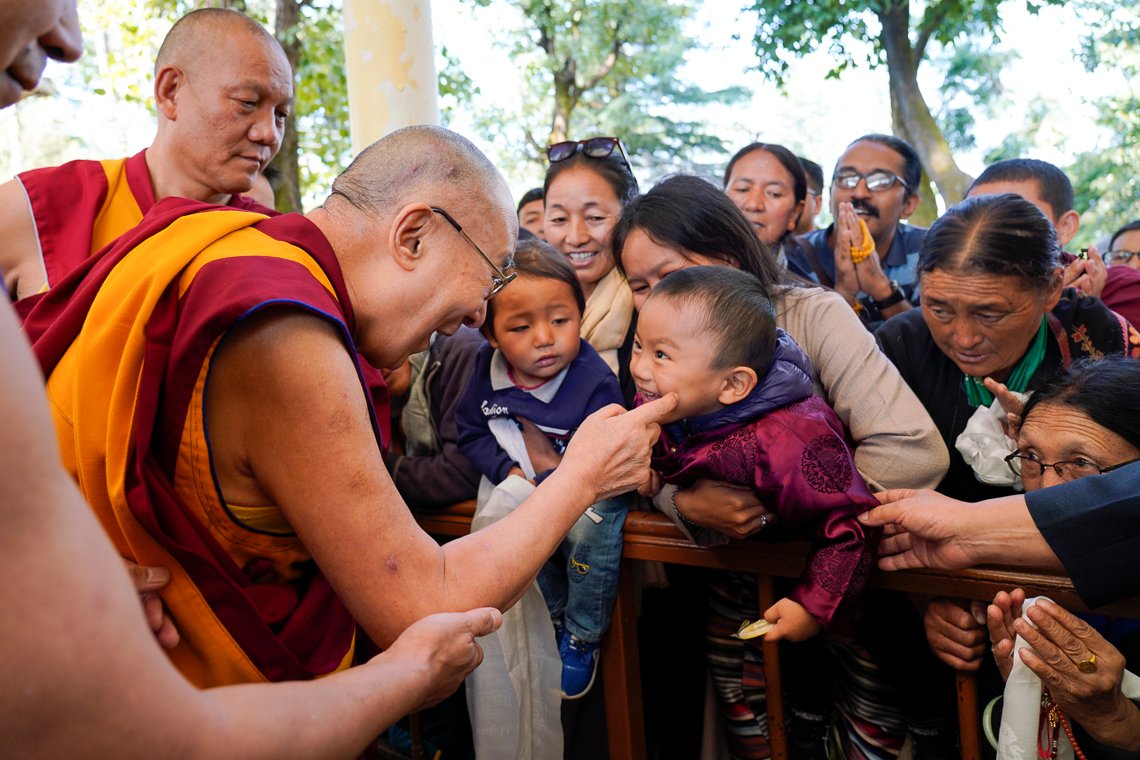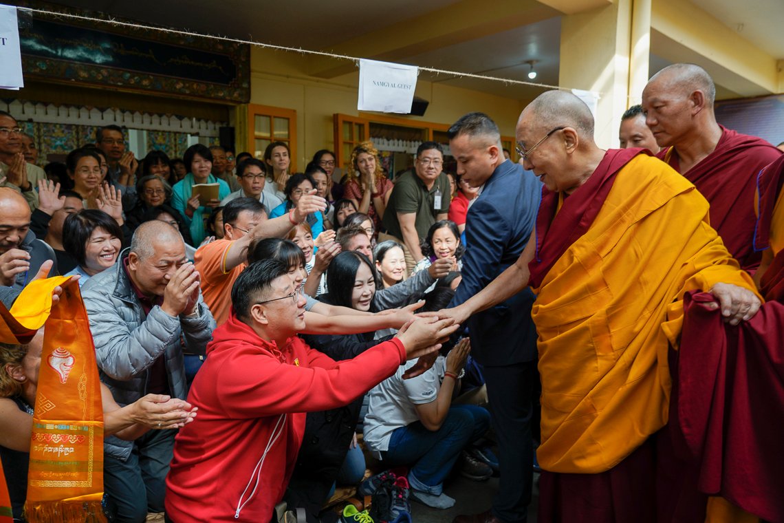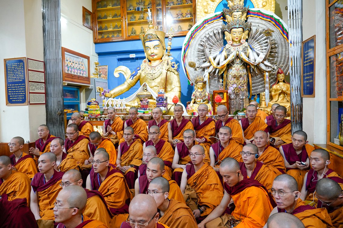 Тхекчен Чолинг, Дхарамсала, Индия, 3 октября 2019 г. – Сегодня утром, когда Его Святейшество Далай-лама шел пешком из своей резиденции в главный тибетский храм Цуглакханг, на безоблачном небе сияло солнце. По дороге он приветствовал людей, собравшихся во дворе и вокруг храма, то и дело нежно гладя по щекам маленьких детей, перебрасываясь парой слов то с одним, то с другим и махая рукой тем, кто стоял поодаль. Войдя в храм, он почтительно поприветствовал бывшего держателя трона монастыря Ганден Ризонга Ринпоче, после чего занял свое место. Тайские монахи пропели Мангала-сутту на пали, а затем прозвучала Сутра сердца на китайском.