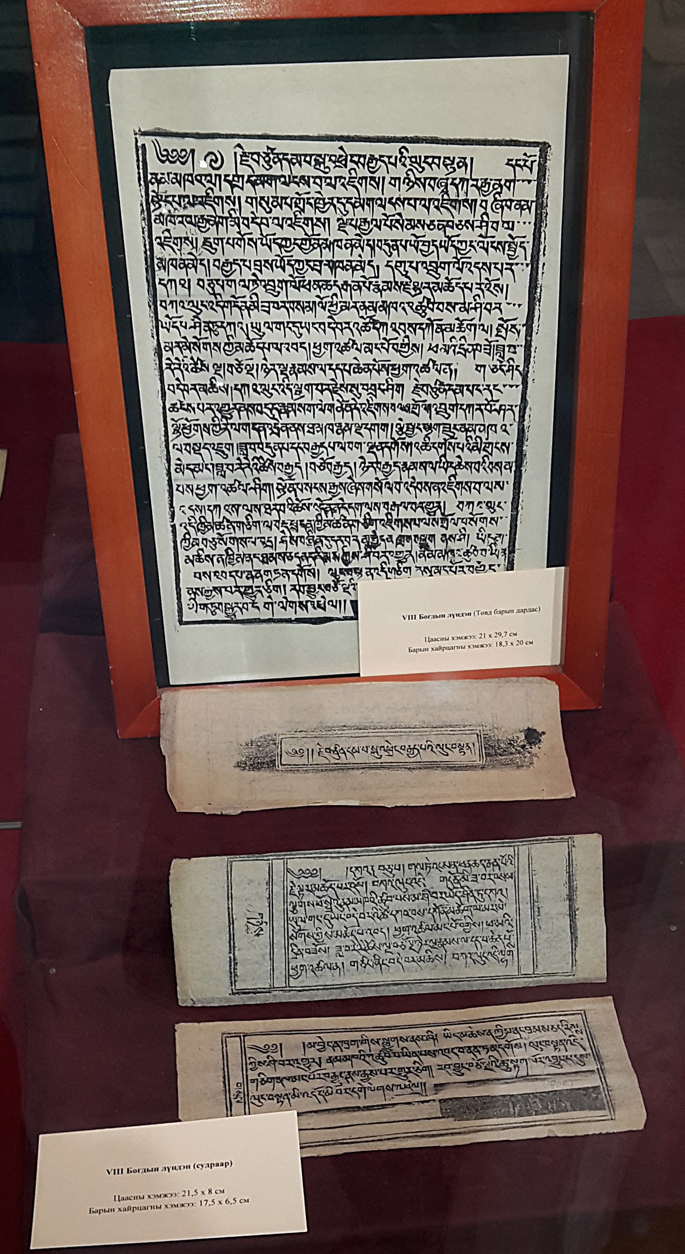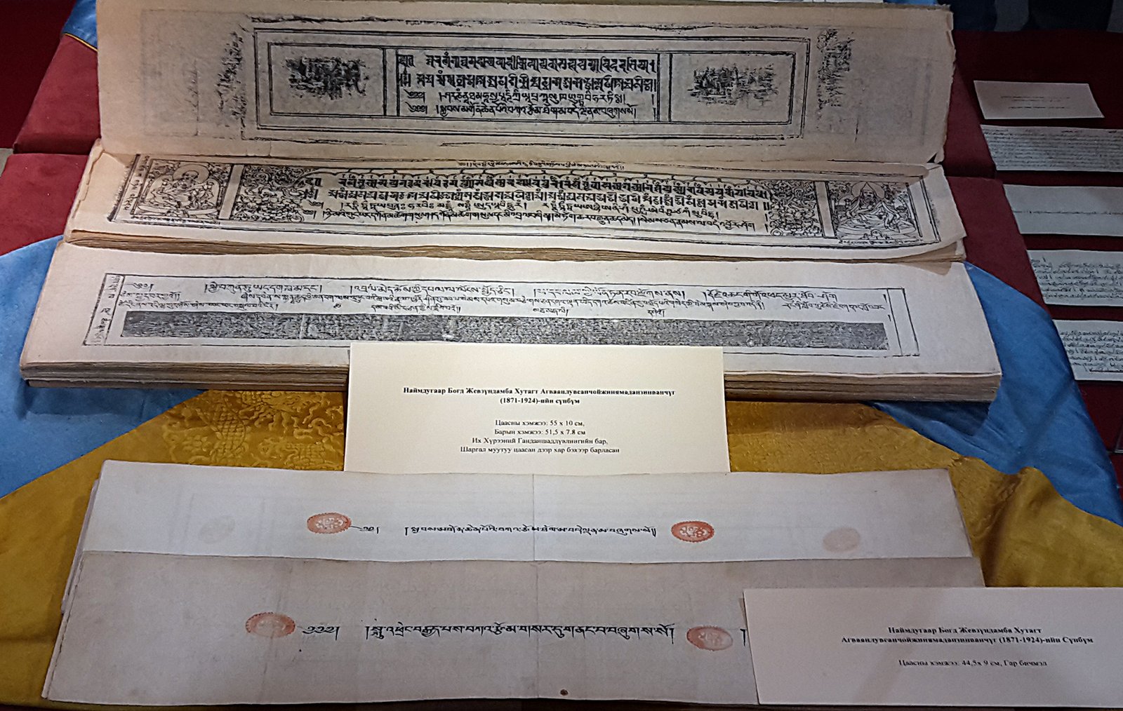Ксилографов и рукописей больше других экспонатов. Представлены отдельные тома изданных в Монголии по указу Богдо-гэгэна VIII ксилографическим способом тибетские канонических книг Ганжур, Данжур, Жадонба, некоторые другие буддийские ксилографические книги, связанные с ним, сумбум (собрание сочинений) Богдо-гэгэна VIII.