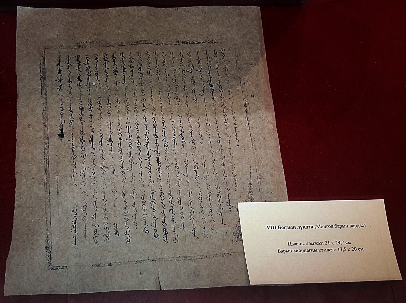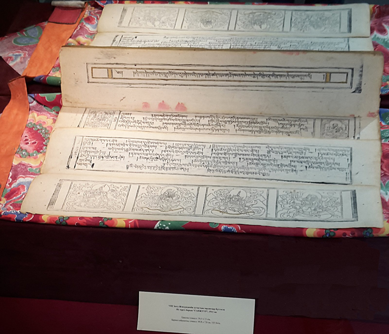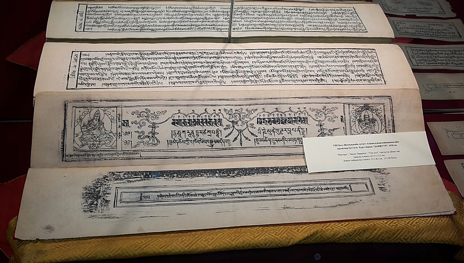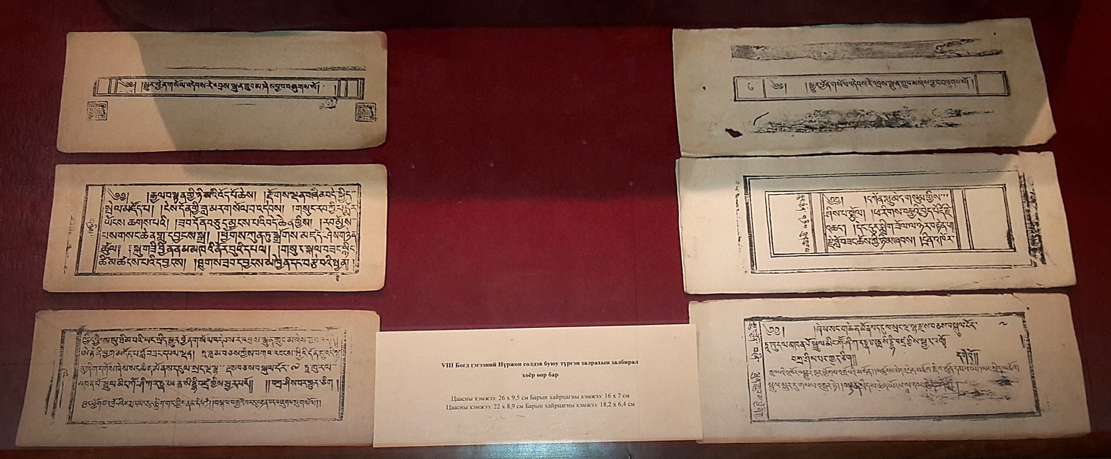 На выставке есть ксилограф (на тибетском) c толкованием религиозно-поучительного распева, который сложил Богдо-гэгэн VIII, когда был арестован китайскими оккупантами в 1920 г. (109 листов). Его автор – Угалзын-лама Лувсансодовжамц (1885–1961). Экспонированы также ксилографы и молитвы Богдо-гэгэна VIII, а также ксилографы Нюрджон солдеб – молитвы о быстром возвращении Богдо-гэгэна VIII после смерти.
