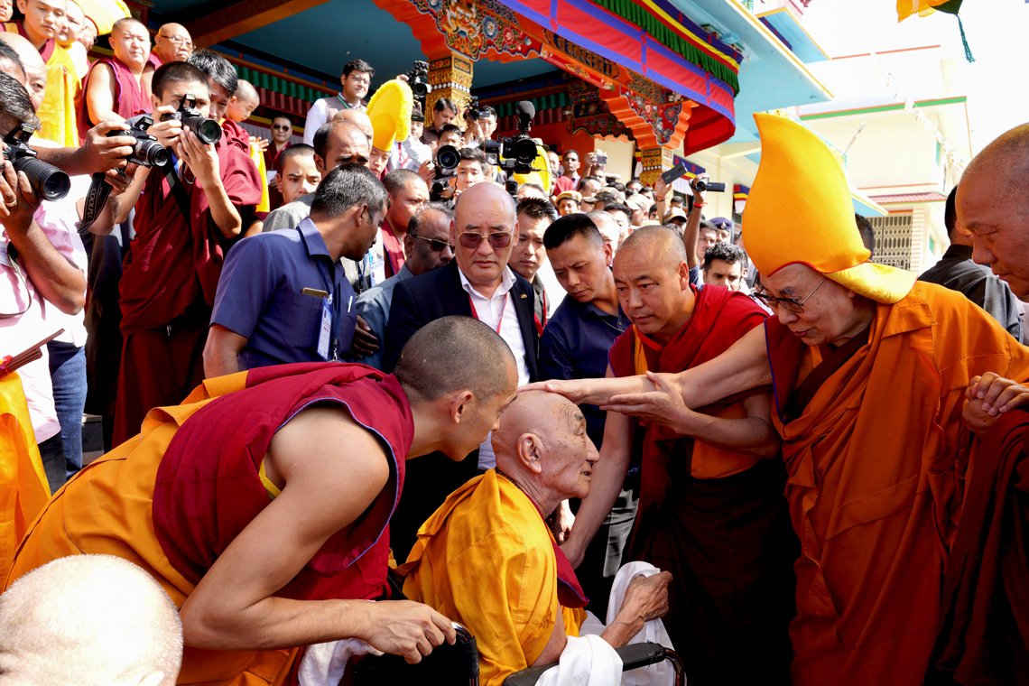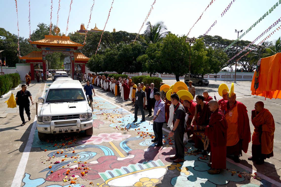 Когда кортеж Его Святейшества Далай-ламы подъезжал к монастырю Дрепунг Лачи, с крыши храма громогласные звуки труб возвестили о его прибытии. Во дворе монастыря Далай-ламу встречали предыдущий держатель трона монастыря Ганден Ризонг Ринпоче, действующий держатель трона, а также Шарпа и Джангце Чойдже. Поднимаясь по ступеням и идя по центральному проходу зала собраний, Его Святейшество махал рукой собравшимся, временами останавливаясь, чтобы поздороваться со многими старыми друзьями, которых он замечал в толпе. Подойдя к трону, он поклонился священным изображениям, а также ненадолго зашел в комнату защитника, после чего занял свое место на троне во главе зала.