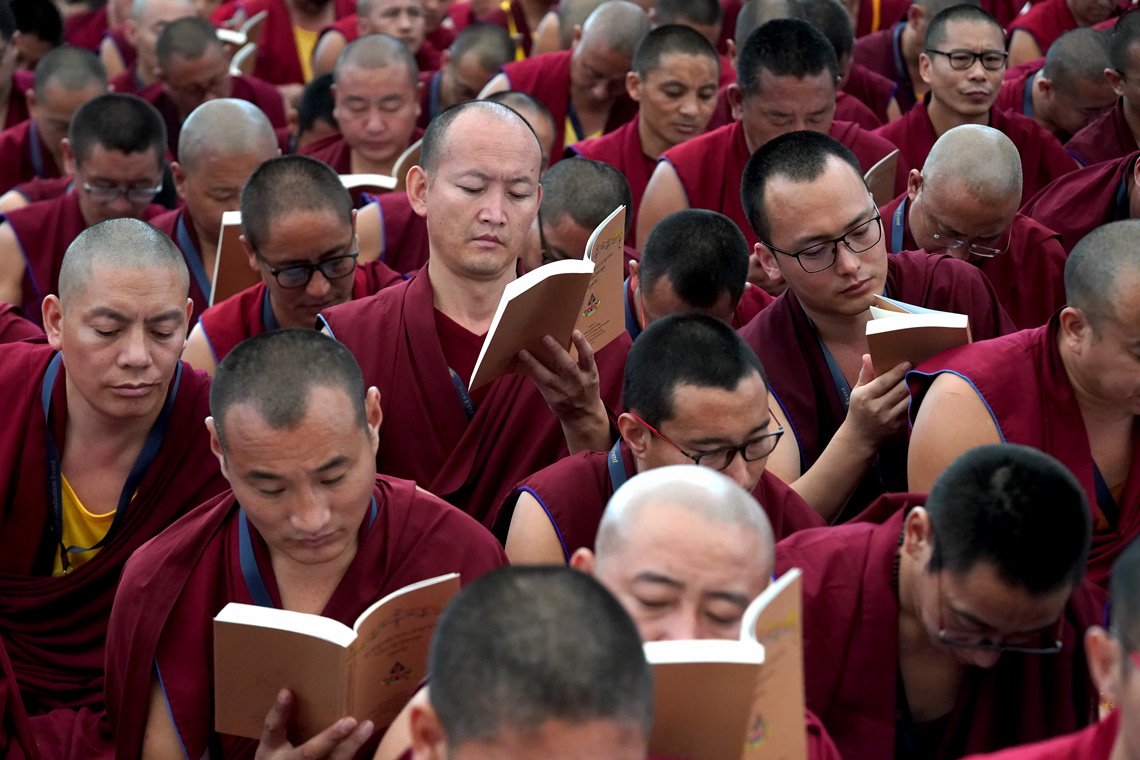 Монахи следят за текстом во время учения Его Святейшества Далай-ламы в новом зале для диспутов монастыря Дрепунг Гоманг. Фото: Лобсанг Церинг.