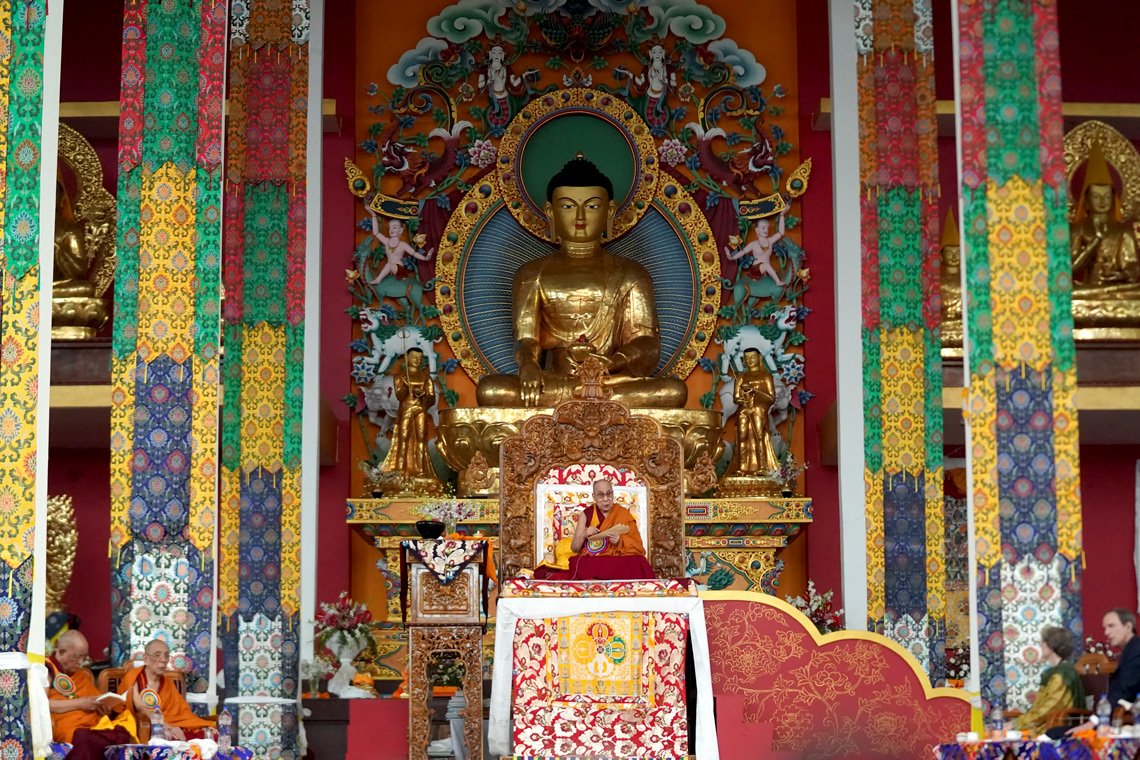 Его Святейшество Далай-лама дарует учение по «Восхвалению 17 пандитам славной Наланды» во время визита в новый зал для диспутов монастыря Дрепунг Гоманг. Фото: Лобсанг Церинг.