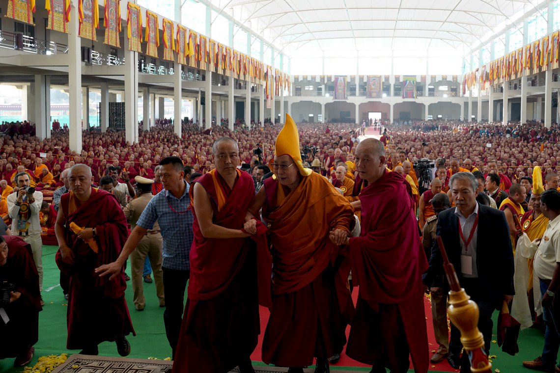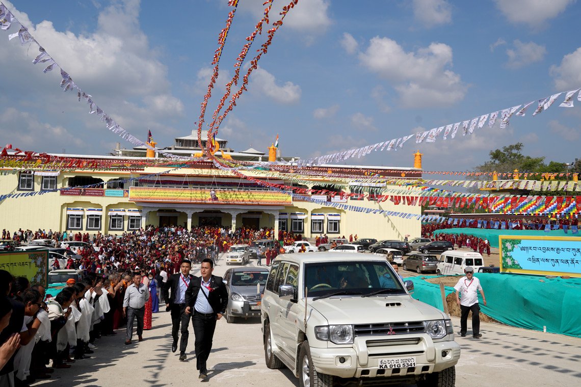 Его Святейшество Далай-лама прибывает в новый зал для диспутов монастыря Дрепунг Гоманг. Фото: Лобсанг Церинг.