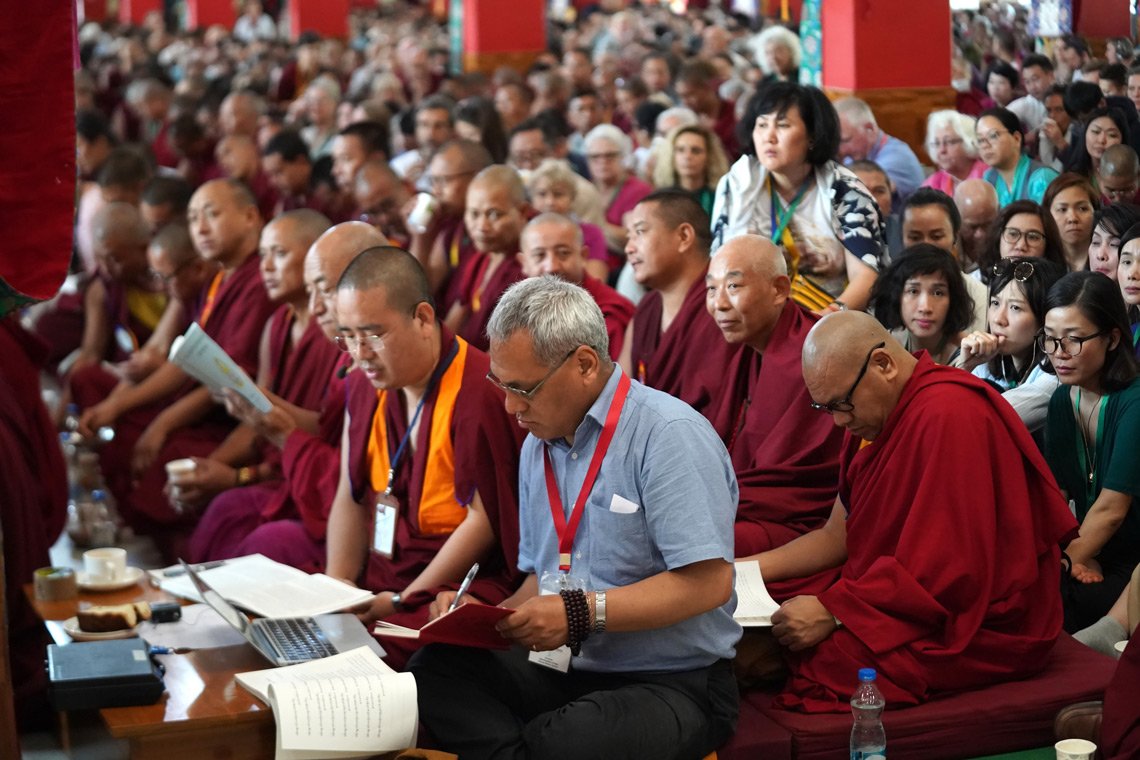 Слушатели следят за текстом во время докладов на симпозиуме по трактату Арьядевы «400 строф о срединности». Фото: Лобсанг Церинг.