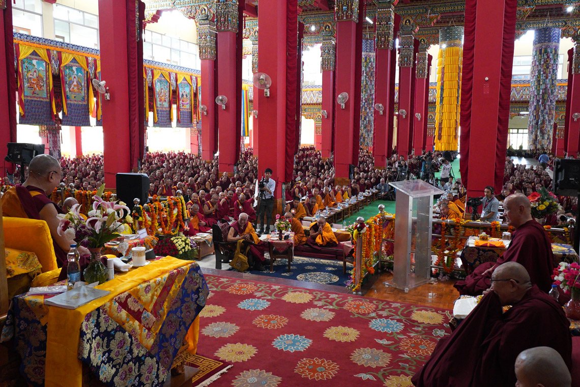 Мундгод, штат Карнатака, Индия, 17 декабря 2019 г. – Сегодня утром порядка 15000 монахов и монахинь и около 9500 гостей и местных жителей заполонили зал собраний и двор монастыря Дрепунг Лоселинг. Все они прибыли на открытие симпозиума по трактату Арьядевы «400 строф о срединности» (Чатухшатака).