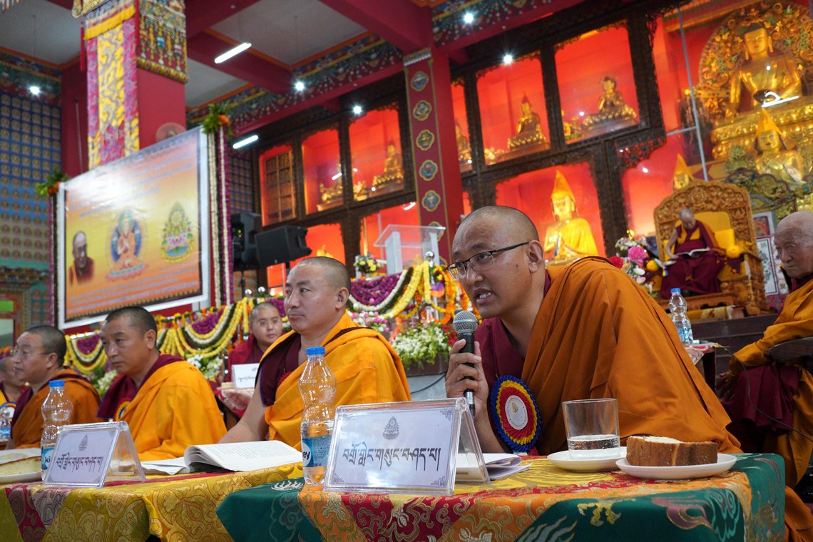 Один из монахов-ученых выступает с докладом во время симпозиума по трактату Арьядевы «400 строф о срединности». Фото: Лобсанг Церинг.
