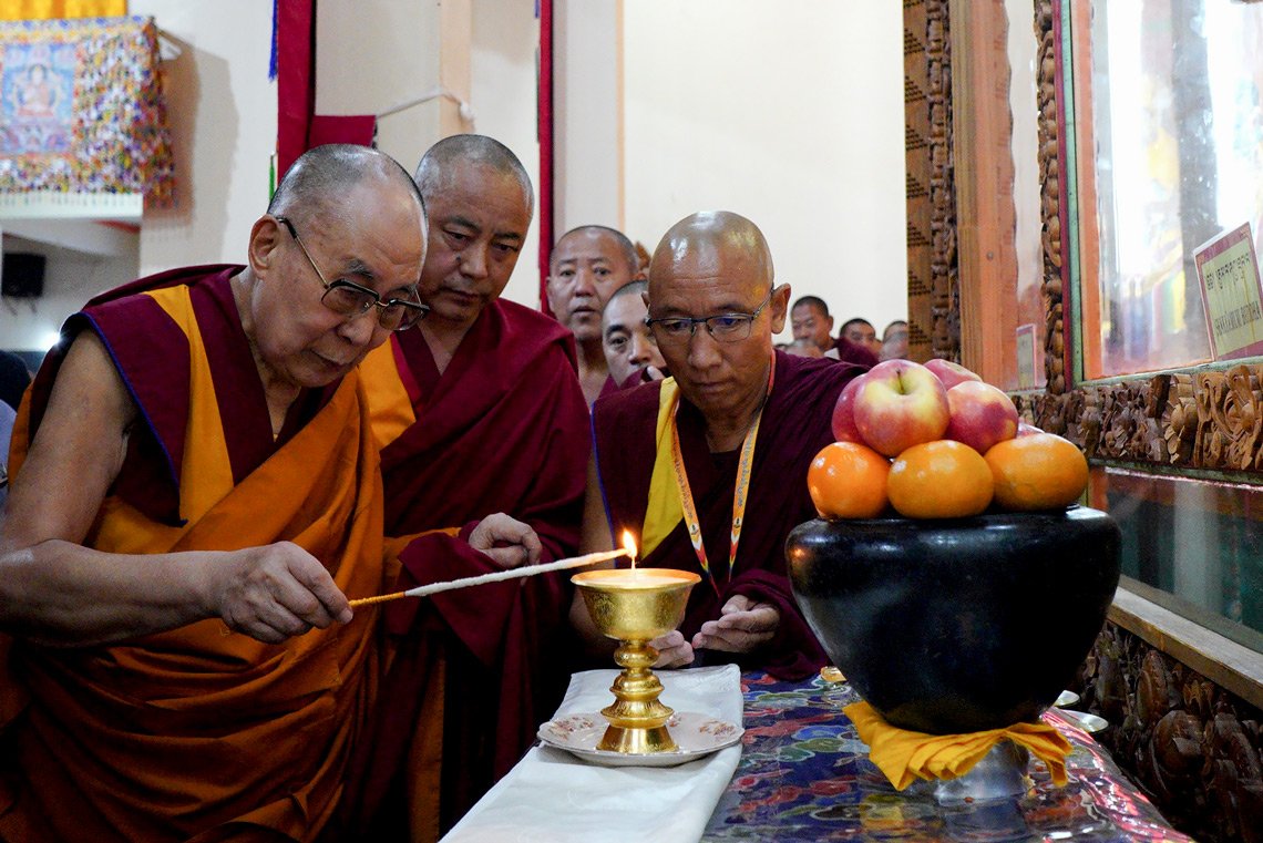 По прибытии в монастырь Ганден Лачи на открытие международной конференции «Чже Цонкапа: жизнь, философия и наследие» Его Святейшество Далай-лама возжигает масляную лампаду. Фото: Джереми Рассел.