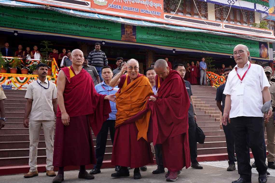 Его Святейшество вышел из зала собраний Ганден Лачи и пешком отправился обратно в Ганден Шарце. На ступенях он остановился, улыбнулся и помахал верующим, которые в ответ махали ему, смеялись и радостно хлопали в ладоши.