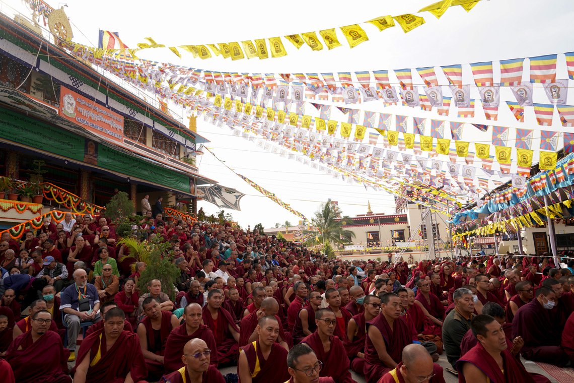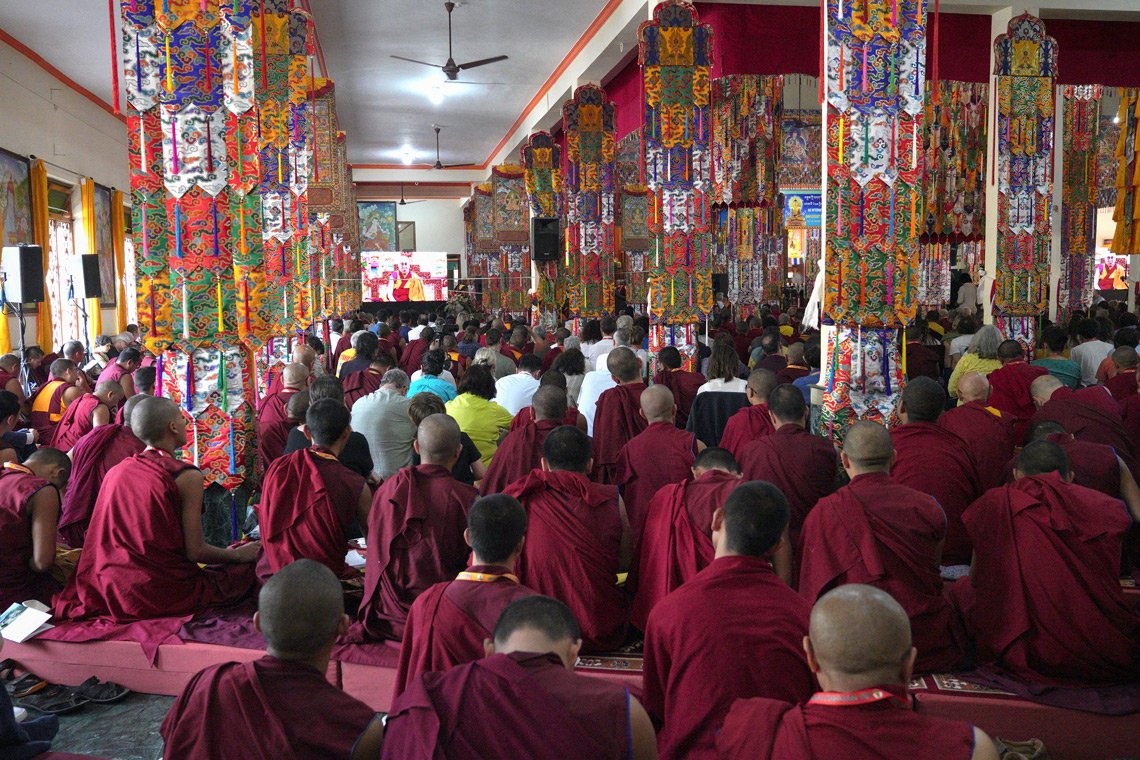 Мундгод, штат Карнатака, Индия, 20 декабря 2019 г. – Сегодня утром Его Святейшество Далай-лама направился из монастыря Ганден Шарце в зал собраний Ганден Лачи, в стенах которого его ожидали 1000 человек. Еще более 4000 человек расположились в тени снаружи храма. Его Святейшество сопровождал настоятель монастыря Шарце досточтимый Джангчуб Сангье. Далай-лама зажег у расположенных на алтаре изображений Будды масляную лампаду и занял место на кресле перед троном.