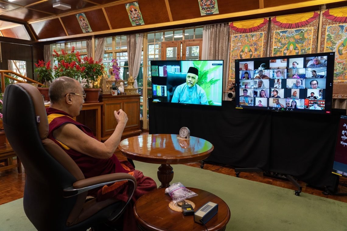 Его Святейшество Далай-лама отвечает почетному профессору датуку Осману Бакару во время диалога на тему «Сострадание и милосердие – общие ценности в исламе и буддизме». Дхарамсала, штат Химачал-Прадеш, Индия. 28 сентября 2020 г. Фото: дост. Тензин Джампхел.
