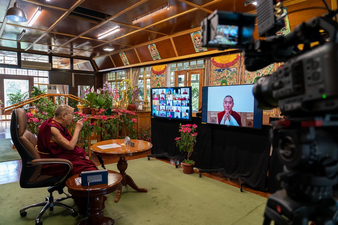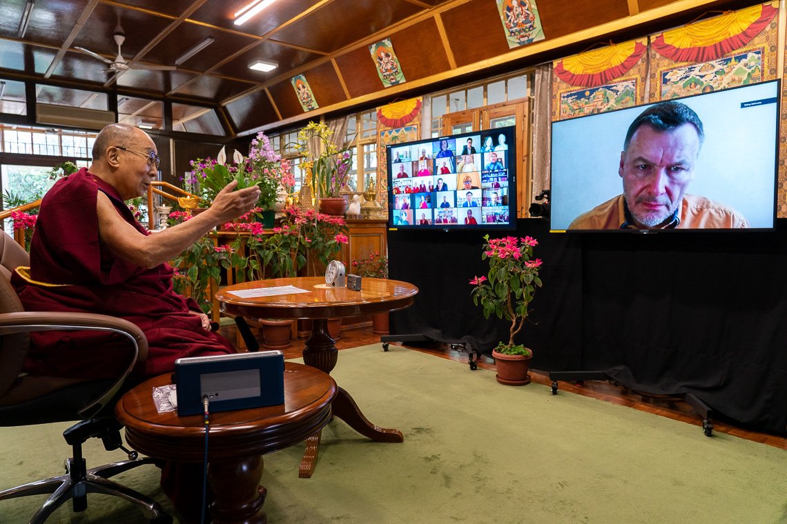 Его Святейшество Далай-лама отвечает на вопросы российских нейроученых во время диалога на тему «Как изучать медитацию методами современной науки?». Дхарамсала, штат Химачал-Прадеш, Индия. 5 мая 2021 г. Фото: дост. Тензин Джампхел.