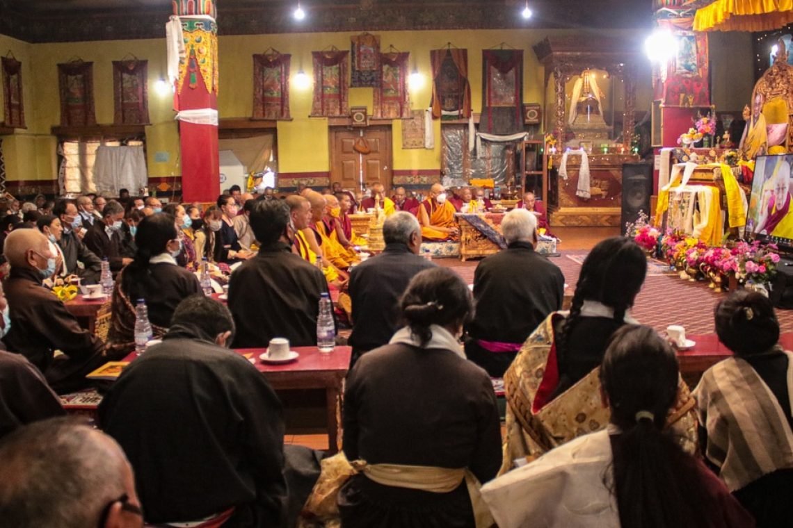 Тхекчен Чолинг, Дхарамсала, штат Химачал-Прадеш, Индия, 14 июля 2021 г. – Сегодня утром Его Святейшество Далай-лама вошел в гостиную своей резиденции, помахал слушателям, лица которых видел на экранах, и занял свое место. Тем временем в монастыре Тикси в Ладаке досточтимый Тикси Ринпоче совершил простирания и вместе с собравшимися в храме Джокханг в Ле поднес духовному лидеру мандалу.