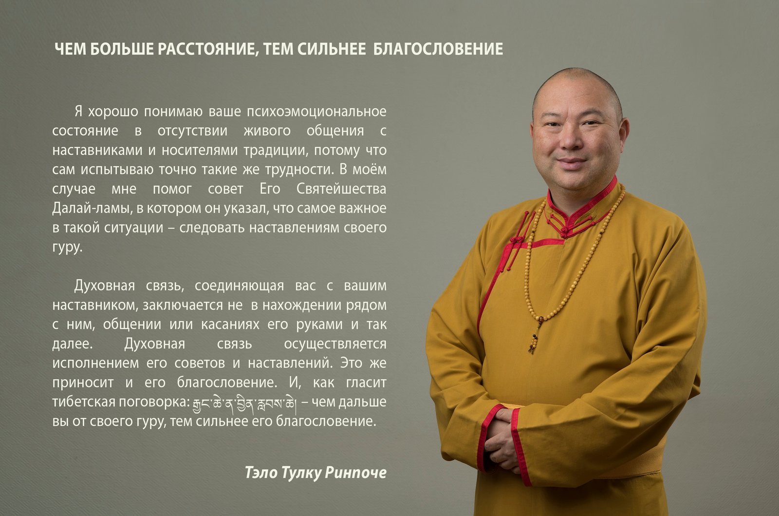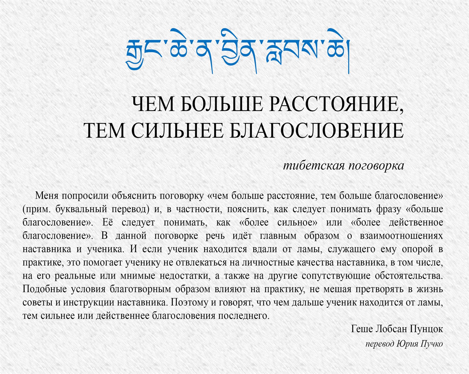 «Меня попросили объяснить поговорку «чем больше расстояние, тем больше благословение» (прим. буквальный перевод) и, в частности, пояснить, как следует понимать фразу «больше благословение». Её следует понимать, как «более сильное» или «более действенное благословение». В данной поговорке речь идёт главным образом о взаимоотношениях наставника и ученика. И если ученик находится вдали от ламы, служащего ему опорой в практике, это помогает ученику не отвлекаться на личностные качества наставника, в том числе, на его реальные или мнимые недостатки, а также на другие сопутствующие обстоятельства. Подобные условия благотворным образом влияют на практику, не мешая претворять в жизнь советы и инструкции наставника. Поэтому и говорят, что чем дальше ученик находится от ламы, тем сильнее или действеннее благословения последнего».