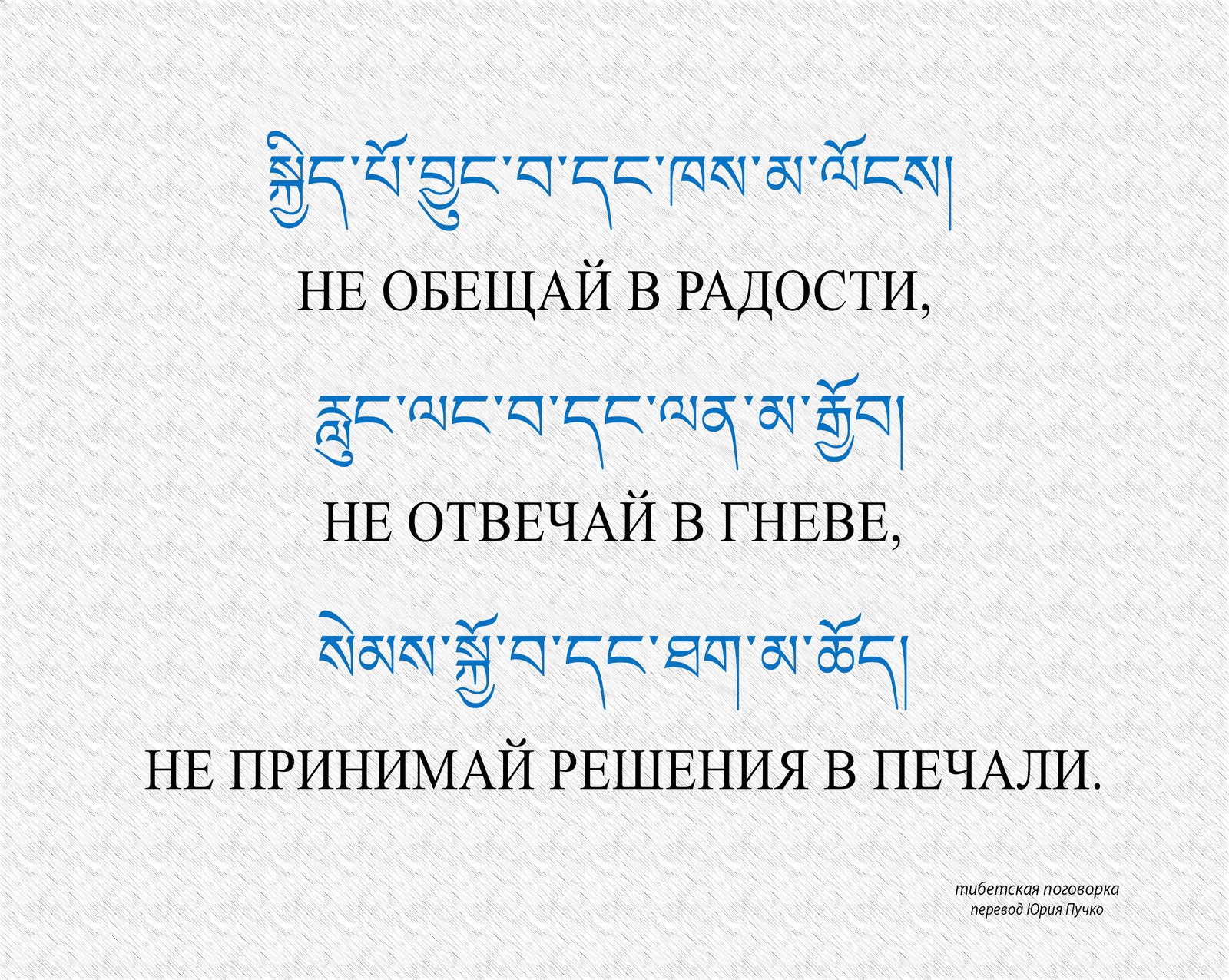 Однако даже среди тибетских поговорок есть особые экземпляры, представляющие собой прямые практические наставления, сублимирующие и соединяющие воедино самые важные советы и рекомендации, извлечённые из рассыпанных по разным разделам Дхармы жемчужин знания. Услышав подобные поговорки в нужное время и в нужном месте, можно серьёзно изменить ход своей жизни или значительно улучшить отношения с окружающим миром. Чего стоит, например, пословица «не обещай в радости, не отвечай в гневе, не принимай решения в печали» (тиб. skyid po byung ba dang khas ma longs rlung lang ba dang lan ma rgyob sems skyo ba dang thag ma chod). Признаюсь, что, однажды услышав её в очень тяжёлой жизненной ситуации, сделал эту поговорку основным руководством к действию в любых сложных обстоятельствах, бросающих вызов комфортному и умиротворённому состоянию.