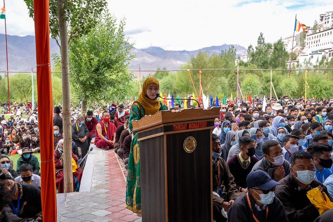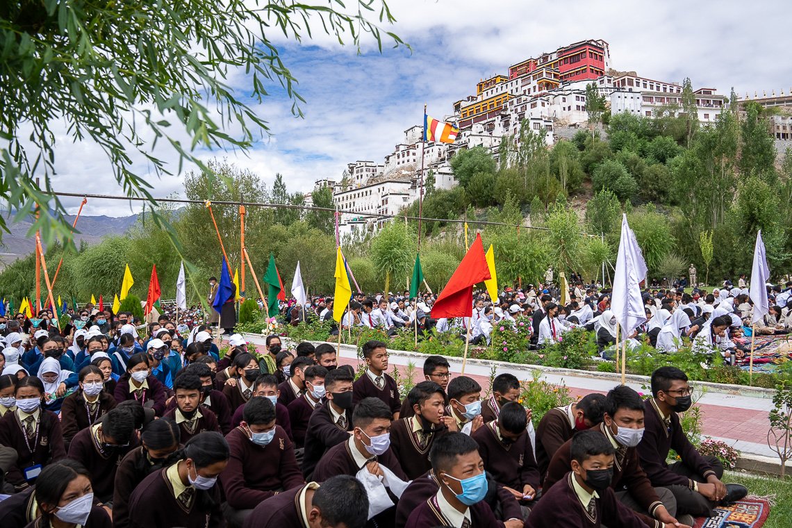 Более 3000 учащихся из 16 школ собрались на выступление Его Святейшества Далай-ламы о светской этике на площадке для учений монастыря Тикси в Ле, Ладак, Индия, 25 июля 2022 года. Фото: Тензин Чойджор
