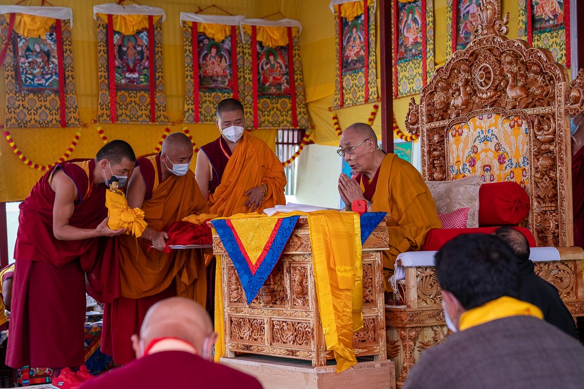 Лингшед, Ле, Ладак, Индия, 10 августа 2022 г. – Сегодня утром Его Святейшество Далай-лама прилетел на вертолете из Ле в деревню Лингшед и сразу поехал к монастырю, где собралось около 3000 ладакцев и паломников из разных стран. Главный исполнительный комиссар и председатель Ладакского автономного горного совета по развитию Таши Гьялсон совершил подношение мандалы, а организаторы десятидневных Великих летних диспутов (Ярчо ченмо) поднесли духовному лидеру шелковые хадаки. Затем Его Святейшество даровал краткое учение по сочинению кадампинского геше Лангри Тангпы «Восемь строф для преобразования ума».