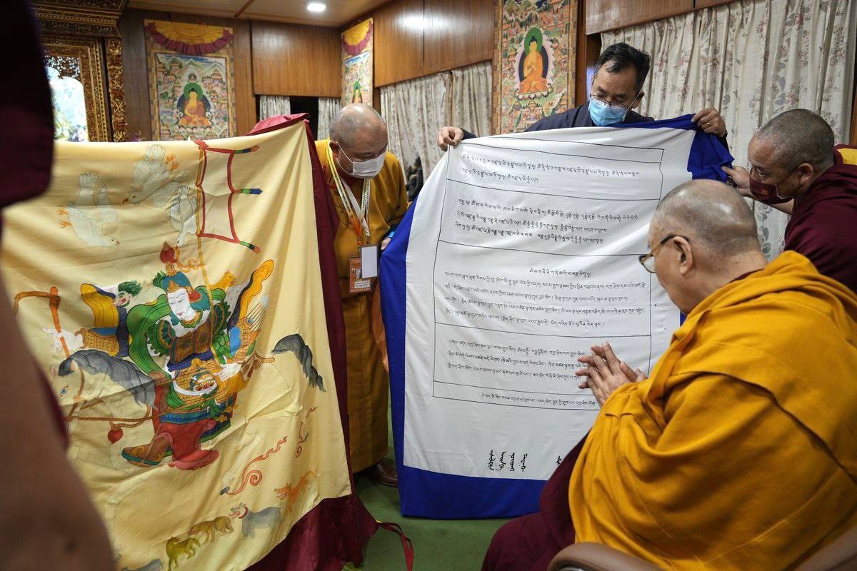 Его Святейшество Далай-лама рассматривает знамя Дайчи Тенгри и знамя нойона Эсэльбейн Сайн-Ка.