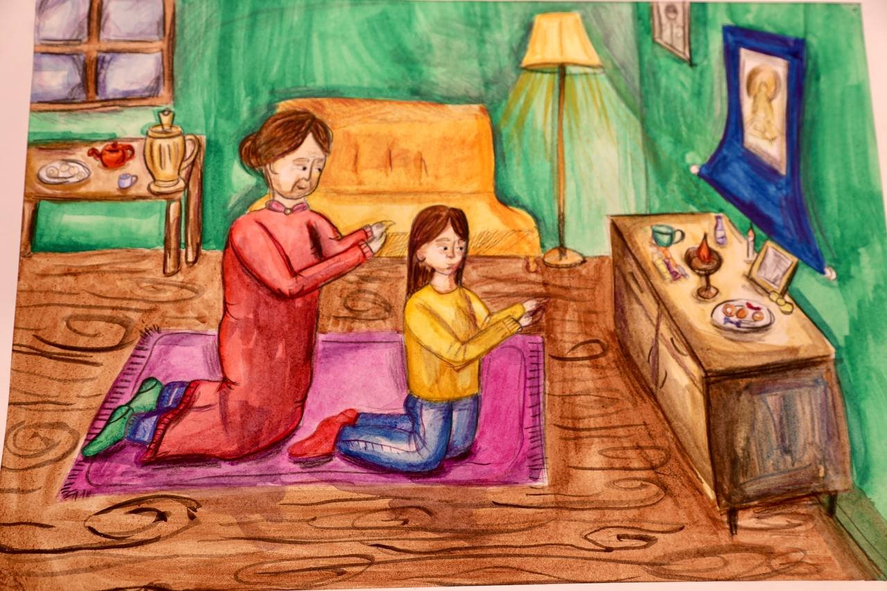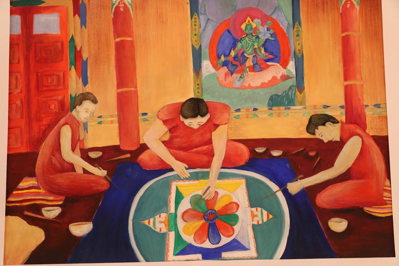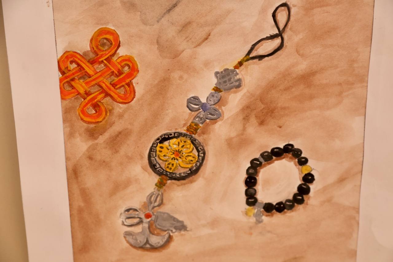 «Молимся с бабушкой», «Построение мандалы», «Молитвенные барабаны» или натюрморт с ритуальными предметами, – в каждой работе отражён мир человека, живущего в Калмыкии, родившегося в республике, рассказ о народе, исповедующий традиционные духовные ценности. Представленные работы юного поколения отличаются яркостью, открытостью, чистотой восприятия и творческой смелостью.