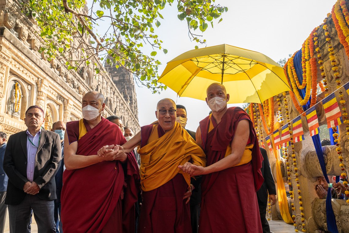 Его Святейшество Далай-лама выходит из храма Махабодхи по завершении молебна. Бодхгая, штат Бихар, Индия. 23 декабря 2022 г. Фото: Тензин Чойджор (офис ЕСДЛ).