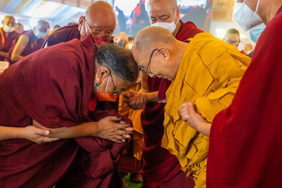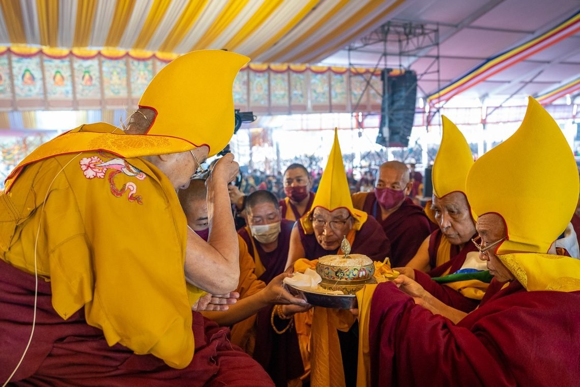 Когда гольфкар Далай-ламы въехал на площадку Калачакры, его поприветствовали настоятели монастырей – их головы венчали желтые шапки с гребнями, в руках они держали белые шелковые хадаки и благовония. Они сопроводили духовного лидера на сцену, ближе к которой его встречали Гаден Три Ринпоче, Шарпа Чодже и Джангце Чодже. Его Святейшество помахал слушателям, поздоровался с досточтимыми ламами и занял свое место на троне. Гаден Три Ринпоче, Шарпа Чодже и Джангце Чодже, возглавлявшие церемонию, сидели прямо напротив Его Святейшества.
