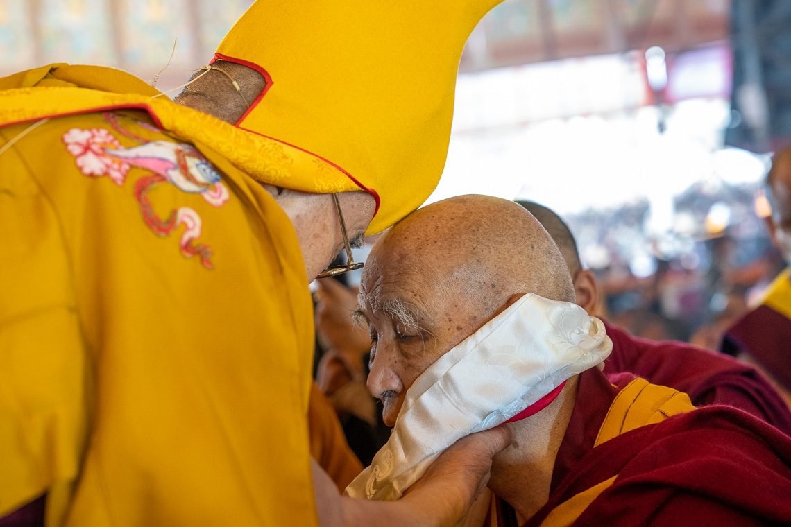 Гаден Три Ринпоче читает хвалу Его Святейшеству Далай-ламе и обращается к нему с просьбой как можно дольше оставаться в этом мире. Бодхгая, штат Бихар, Индия. 1 января 2023 г. Фото: Тензин Чойджор (офис ЕСДЛ).