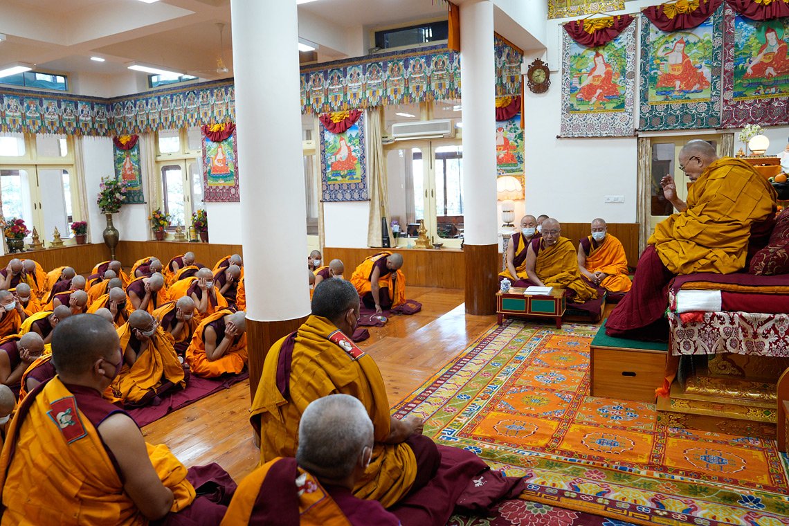 Его Святейшество Далай-лама обращается к собравшимся в заключительный день церемонии дарования монашеских обетов. Дхарамсала, Индия. 26 марта 2023 года. Фото: Тензин Джампел (офис ЕСДЛ).