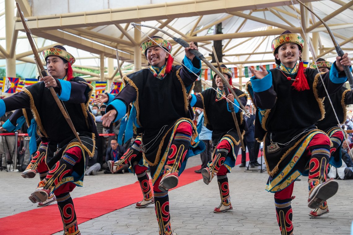 Прежде чем вернуться в свою резиденцию, Его Святейшество полюбовался танцем, зародившимся в тибетском регионе Конгпо, в исполнении артистов Тибетского института исполнительских искусств. Танцоры махали луками, а танцовщицы несли колчаны со стрелами. Его Святейшество взял один из этих колчанов и помахал им перед собой в знак благоприятствования.