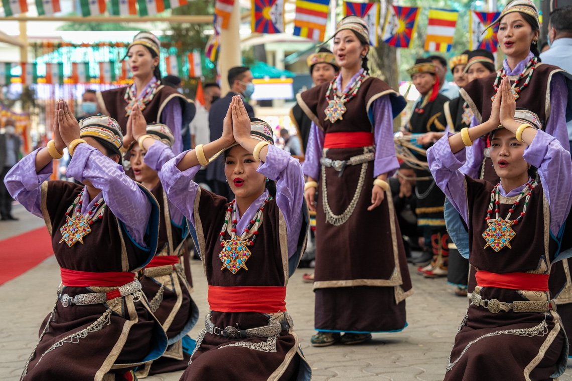 В качестве индийского приветствия Далай-ламе преподнесли цветы и масляный светильник, а также нанесли на лоб священный тилак. Затем ему поднесли традиционное тибетское приветствие, в том числе чема чангпу. Когда он шел по центральной дорожке, ведущей к храму, тибетцы в национальных костюмах протягивали ему белые шелковые хадаки. Далай-лама остановился, чтобы посмотреть танец долголетия «Таши шолпа», который представляли артисты Тибетского института исполнительских искусств. Прежде чем занять свое место, Его Святейшество в знак открытия церемонии принял участие в зажжении масляного светильника перед изображением Сарасвати.