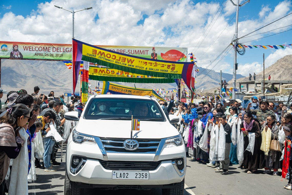 Тысячи местных жителей, ладакцев и тибетцев, облачившихся в свои лучшие одежды и держащих шелковые хадаки, выстроились в живой коридор от аэропорта до самого Шевацель Пходранга, чтобы поприветствовать Его Святейшество.