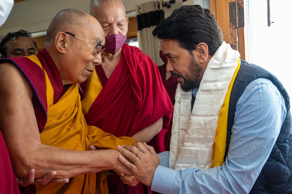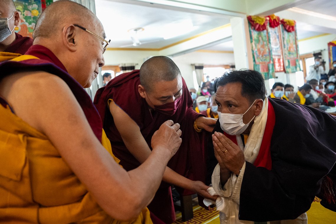 Его Святейшество Далай-лама обращается к высокопоставленным лицам и почетным гостям, прибывшим в его резиденцию в Шевацель, чтобы поприветствовать его. Ле, Ладак, Индия. 11 июля 2023 г. Фото: Тензин Чойджор (офис ЕСДЛ).