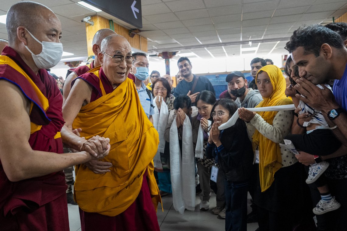 Шевацель Пходранг, Ле, Ладак, Индия, 11 июля 2023 г. – Сегодня утром Его Святейшество Далай-лама вылетел из Дели и около 10:30 прибыл в Ле. В аэропорту его встретили Тиксе Ринпоче, Таглунг Матрул Ринпоче, Таглунг Цетрул Ринпоче, Чадо Ринпоче и Друкпа Кхамдрак Ринпоче, лидеры Ассоциации буддистов Ладака, а также председатель Ладакского автономного горного совета по развитию Таши Гьялсон, член индийского парламента от Ладака Джамьянг Церинг Намгьял и представитель Центральной тибетской администрации Дхондуп Таши.