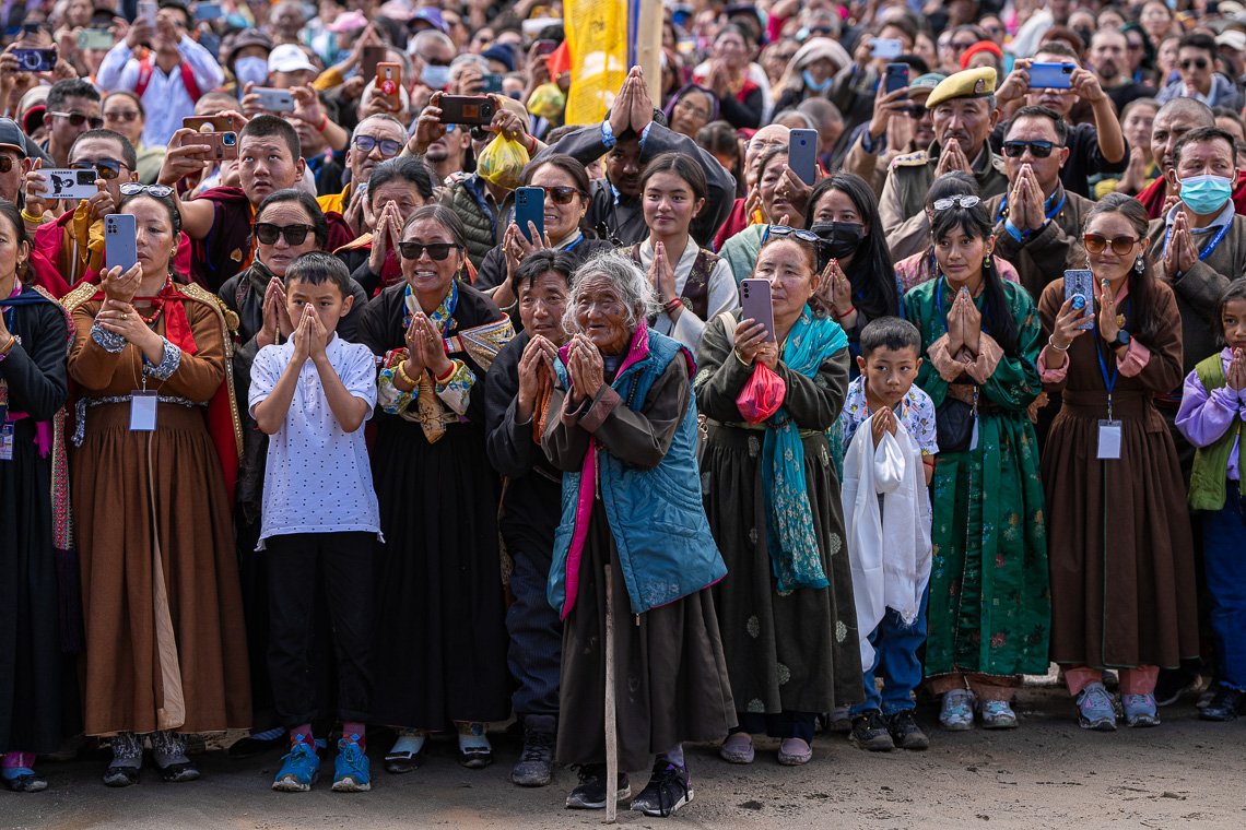 Пока звучала обширная молитва о долголетии Его Святейшества Далай-ламы «Мелодия нектара бессмертия», написанная двумя его наставниками, Кьябдже Лингом Ринпоче и Кьябдже Триджангом Ринпоче, перед сценой тянулась длинная вереница местных жителей, молодых и пожилых. Они несли различные подношения, в том числе собрание священных писаний, мешки с зерном и резные столики. Звучали рожки и барабаны, пели певцы.