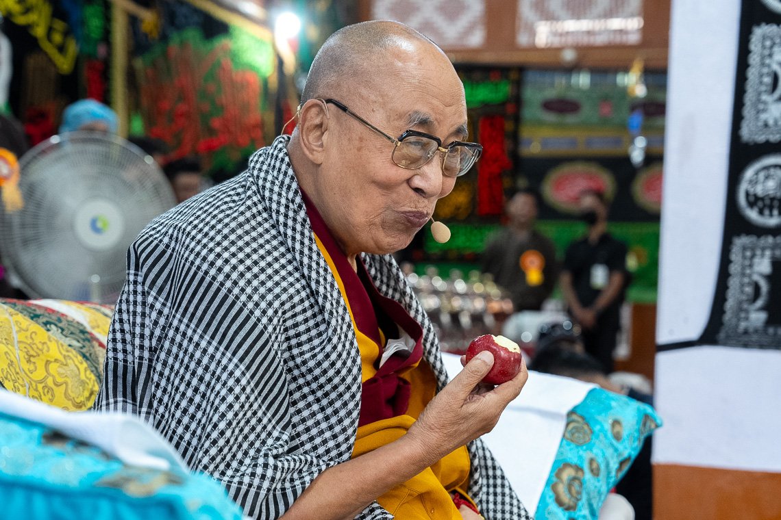 Его Святейшество Далай-лама собирается откусить кусочек абрикоса во время встречи с членами мусульманской общины в мечети «Имам Барга». Ле, Ладак, Индия. 12 августа 2023 г. Фото: Тензин Чойджор (офис ЕСДЛ).