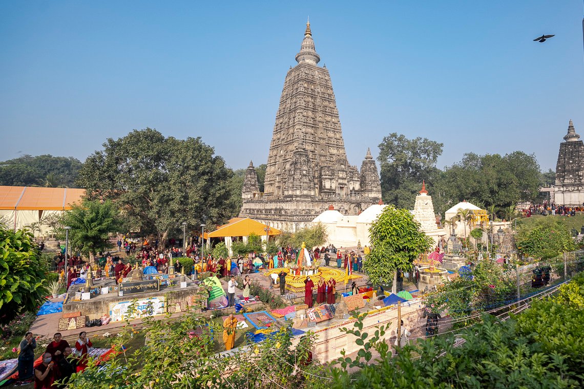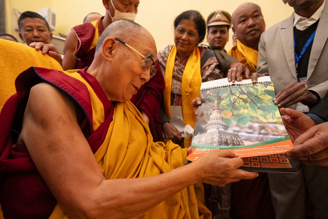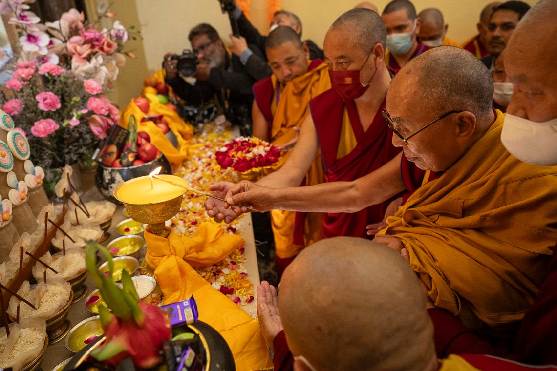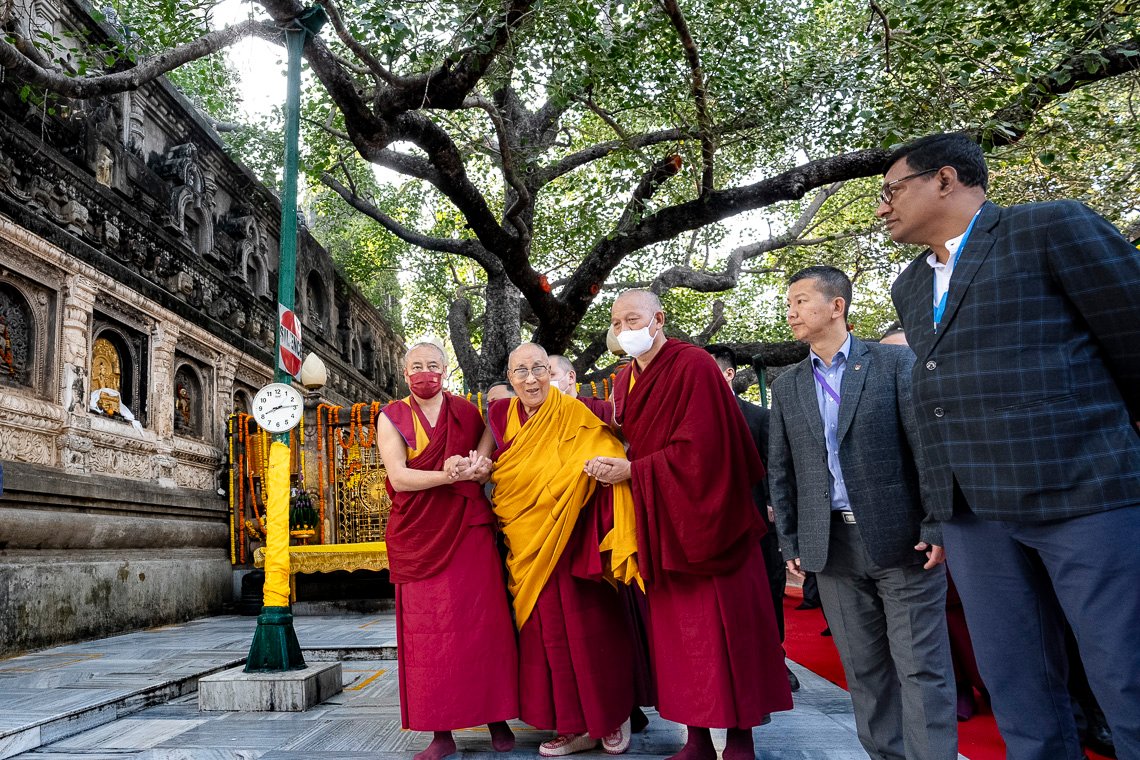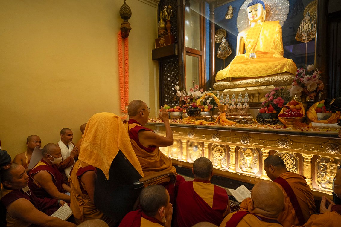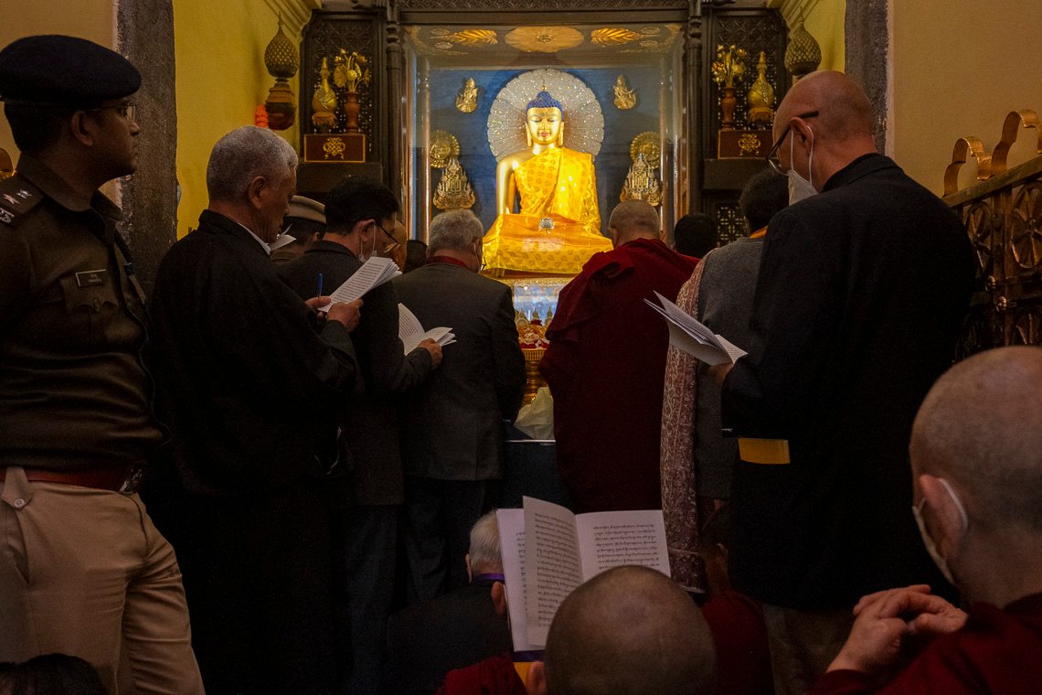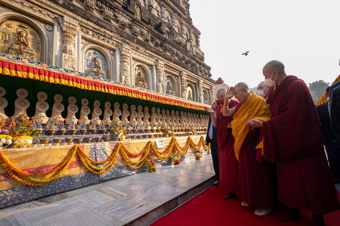 У дверей храма Махабодхи Далай-ламу поприветствовали члены комитета по управлению храмом Бодхгаи. Войдя внутрь, он выразил почтение знаменитой статуе Будды и сел прямо перед ней. Вместе с монахами монастыря Намгьял он прочитал восхваление Будде, известное как «Тройная ежедневная молитва», «Сутру сердца», «Восхваление 17 пандитам славной Наланды», «Хвалу Будде Шакьямуни за учение о взаимозависимости», семичастную молитву из «Молитвы-устремления Самантабхадры», молитву «Слова истины» и другие.