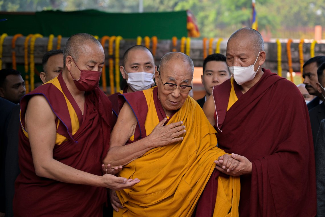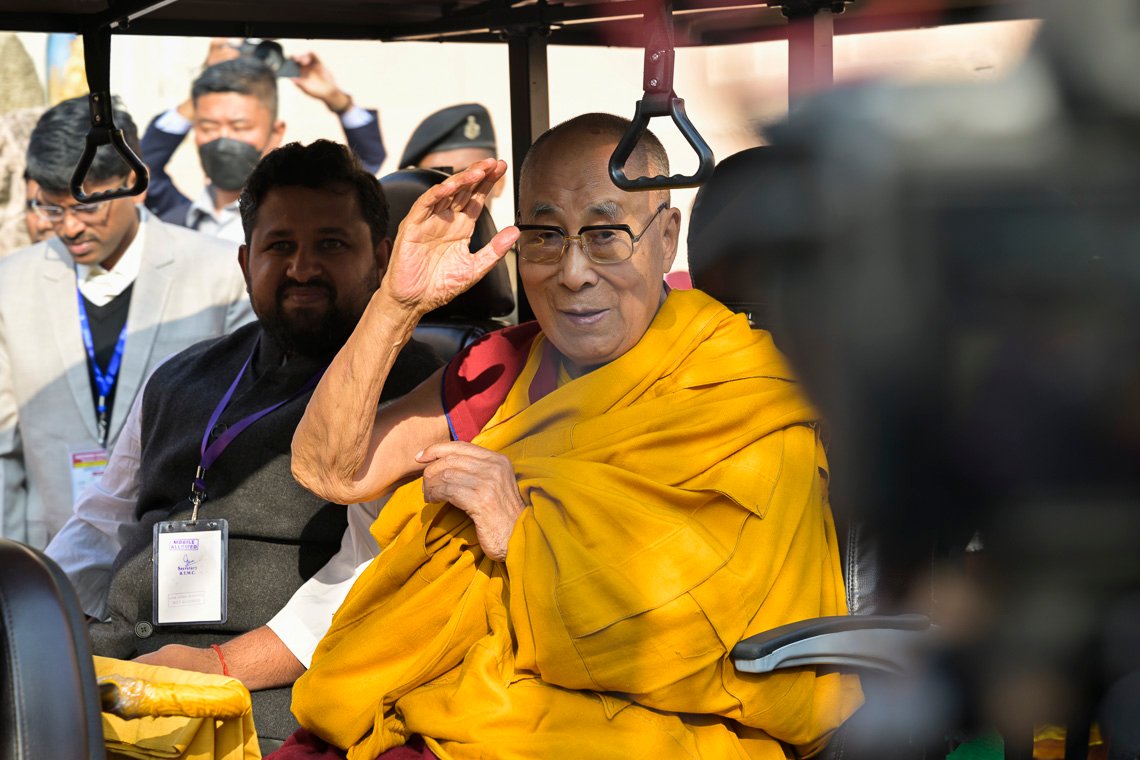 Его Святейшество Далай-лама направляется к храму Махабодхи. Бодхгая, штат Бихар, Индия. 16 декабря 2023 г. Фото: Тензин Чойджор (офис ЕСДЛ).
