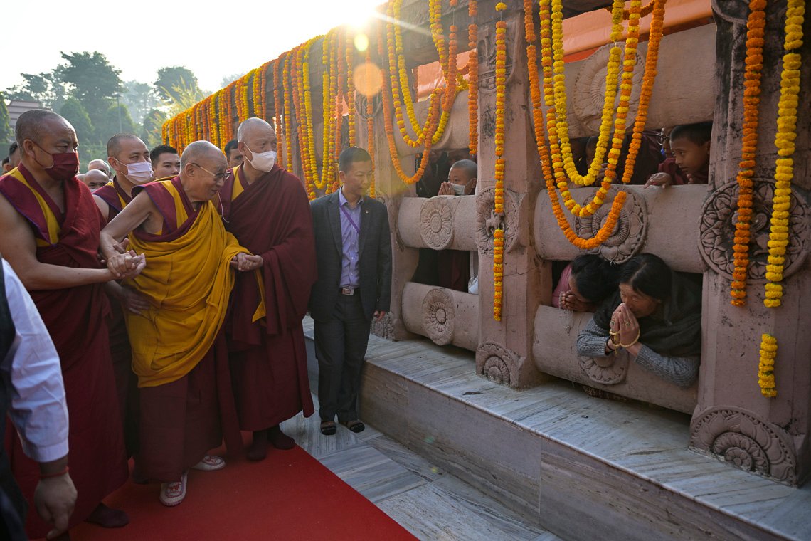 Совершая обход вокруг храма Махабодхи, Его Святейшество Далай-лама приветствует своих последователей. Бодхгая, штат Бихар, Индия. 16 декабря 2023 г. Фото: Тензин Чойджор (офис ЕСДЛ).