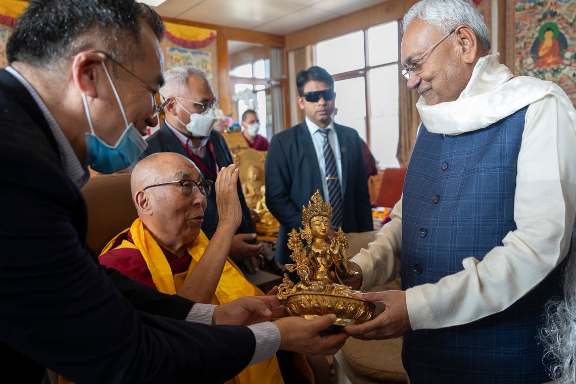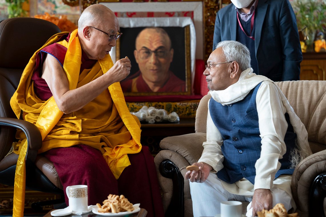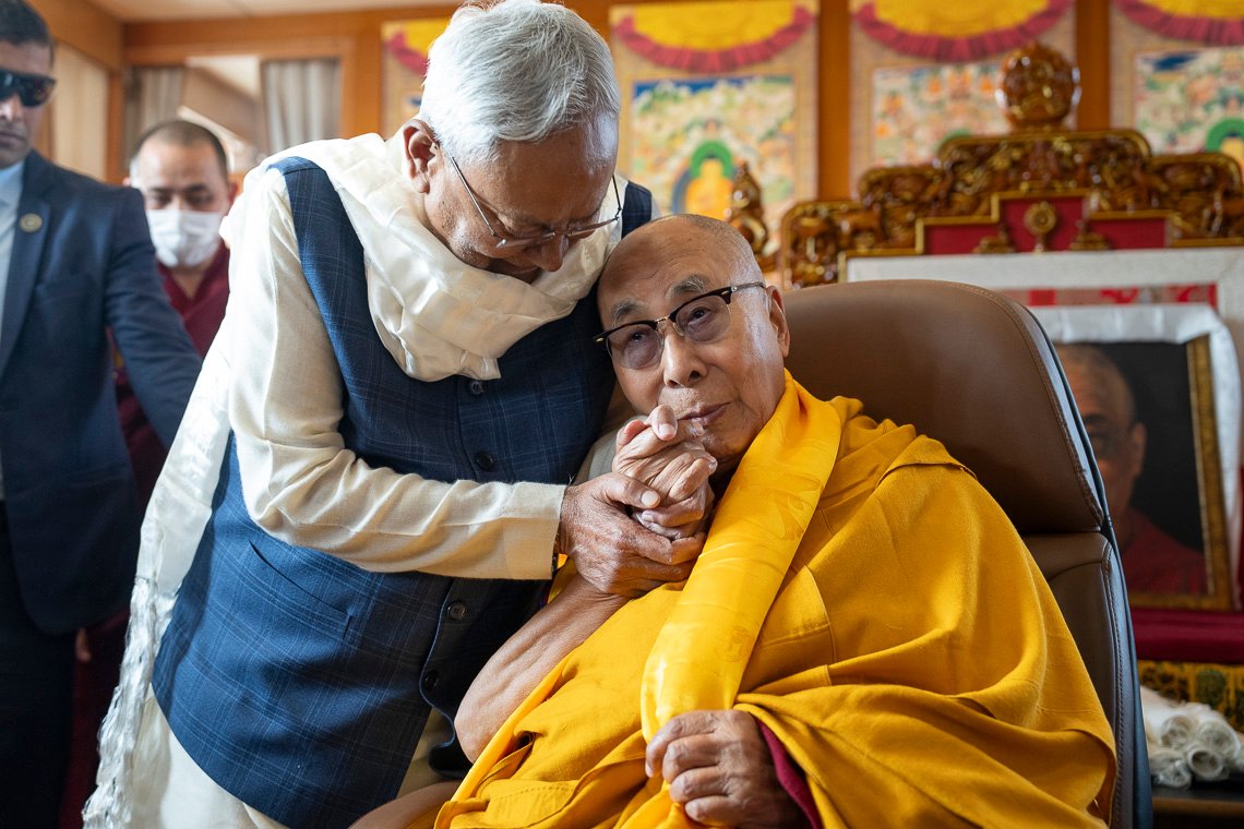 Его Святейшество Далай-лама и главный министр штата Бихар Шри Нитиш Кумар в резиденции Его Святейшества. Бодхгая, штат Бихар, Индия. 21 декабря 2023 г. Фото: Тензин Чойджор (офис ЕСДЛ).