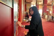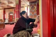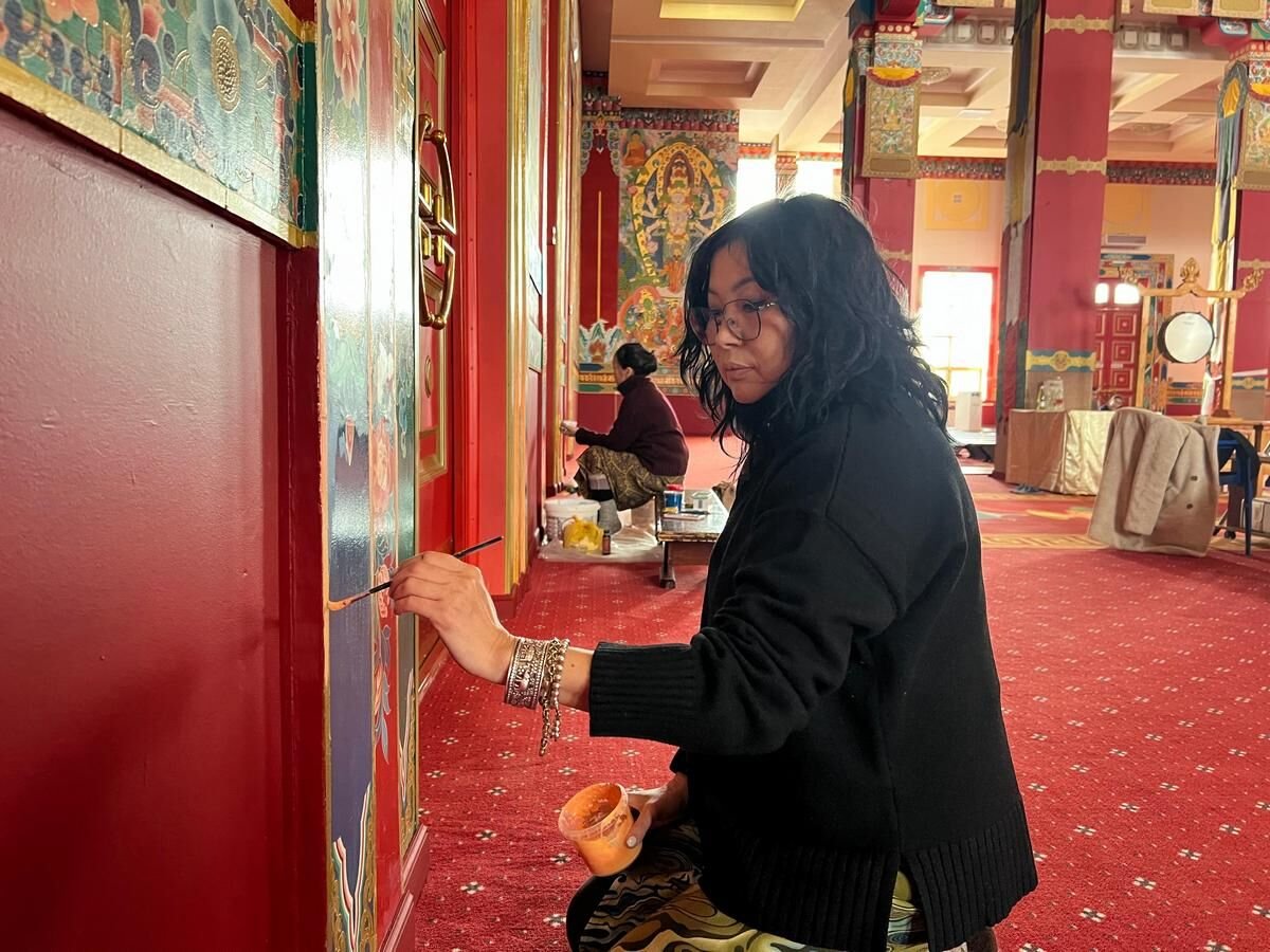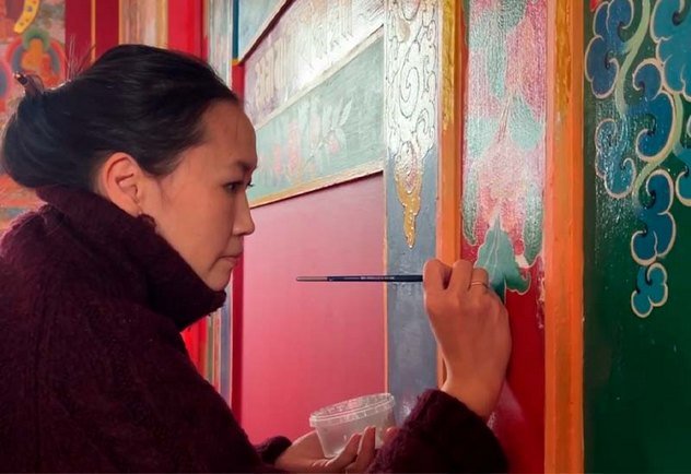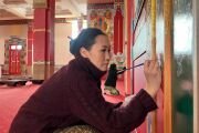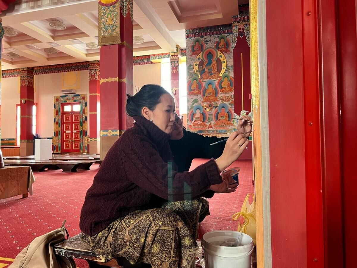 В главном молельном зале Центрального хурула Калмыкии «Золотая обитель Будды Шакьямуни» в эти дни началась реставрация настенных мантр, рисунков и орнаментов. Эту кропотливую работу проводит танкописец Татьяна Музраева. Ей в этом помогают художник Кермен Цебекова и мастер Амра Дорджи-Горяева.