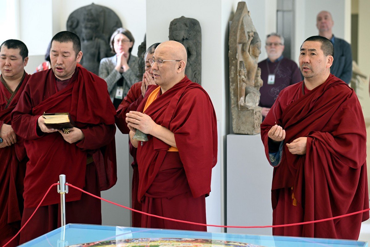 «Она относится к гневному божеству, которое называется Ваджрабхайрава – это гневное воплощение божества мудрости [Манджушри]. Мы очень почитаем это соединение микро- и макрокосмоса, и это, наверное, у нас единственная такая песчаная мандала, которая не разобрана. Дело в том, что буддизм учит: все в мире – это пустота и иллюзия, и разрушение мандалы обычно как раз демонстрирует эту пустотность и эту иллюзорность мира. В данном случае мы сохраняем ее как подарок», – добавила Елихина.