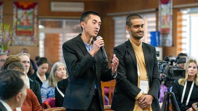Шубхам Сапкот из США, работающий в Непале, и Тим Хуанг из Бутана задают Его Святейшеству Далай-ламе вопрос о том, как школы могут способствовать развитию лидеров, проявляющих больше сострадания. Дхарамсала, штат Химачал-Прадеш, Индия. 21 марта 2024 г. Фото: дост. Замлинг Норбу (офис ЕСДЛ).