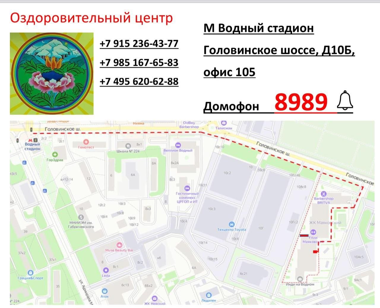 Метро Водный Стадион (последний вагон из центра, из метро направо), ЖК «Маяковский», Головинское шоссе, дом 10Б, подъезд 2, офис 105 (Оздоровительный центр доктора Джигме). Код двери подъезда: 8989, набрать и нажать на кнопку с изображением колокольчика. После входа в подъезд пройти во двор, повернуть направо, к вывеске «Оздоровительный центр». Альтернативные входы во двор жилого комплекса (калитки) указаны на схеме стрелками. Код на калитках – тот же.