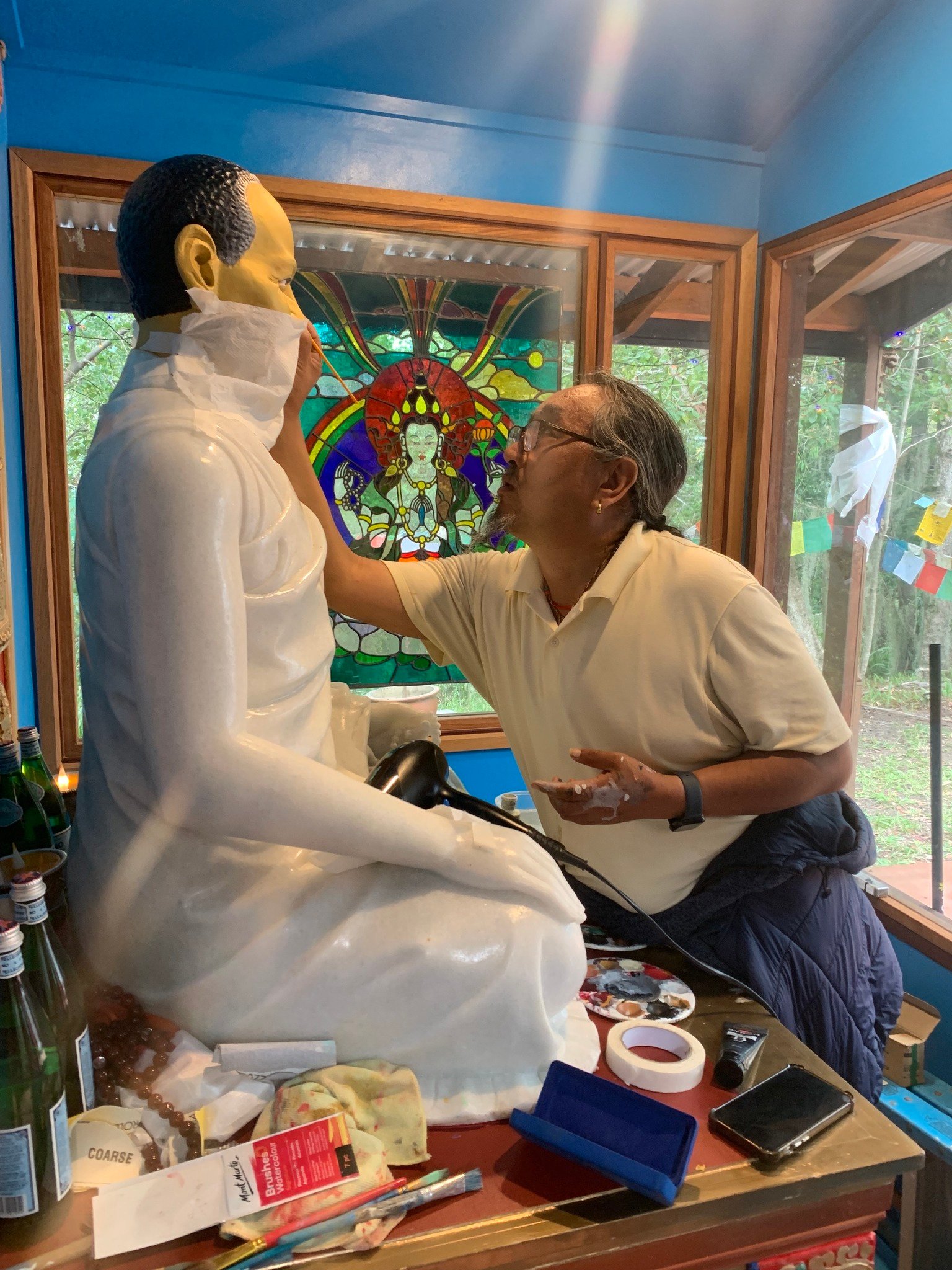 Художественную работу по окрашиванию статуи золотом ведет Тензин Дхаргье, более известный под своим профессиональным псевдонимом Пхенпо Тендар. Мастер происходит из уважаемой семьи Юлна Кхари Кхангсар, девятого поколения в роду почитаемых художников Пхенпо, чье наследие восходит к 1600-м годам и связано с работой по тханкописи со времен V Далай-ламы.