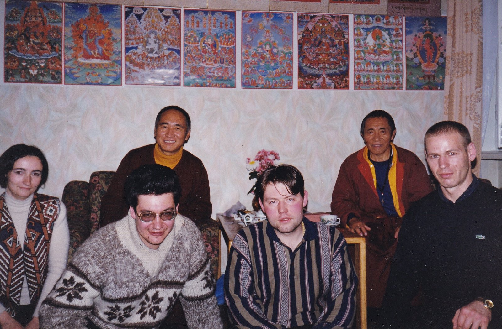 «Мы начали собираться на совместные практики далеким летом 1995 года после поездки на ретрит кенчена Палдена Шераба Ринпоче и кенпо Цеванга Донгьяла Ринпоче в Подмосковье. Мы стали встречаться, образовав петербургский буддийский центр Падмасамбхавы, выполняя практики, которые получили от наших замечательных учителей – драгоценных Кенпо Ринпоче: гуру-йогу «Дождь благословений» Мипама Ринпоче, практику шитро видьядхары Катога Пемамати, садхану Будды Шакьямуни и, читая сутру Сердца. Наш круг общения постепенно увеличивался, мы осваивали новые практики, в частности, садхану Тринле нингпо, полученную от Чокьи Нимы Ринпоче. После приезда драгоценных Кенпо Ринпоче в Петербург и официального создания петербургского буддийского центра Падмасамбхавы в 1997 году, сформировался костяк нашего центра. Нас связывали дружеские узы, а также желание вместе практиковать и организовывать ретриты наших драгоценных учителей. Весной 1999 года мы впервые пригласили в Россию Раньяка Патрула Ринпоче, и осенью того же года, по нашей просьбе, Патрул Ринпоче основал питерский центр «Дзогчен Дудул Чолинг», что можно перевести как «Обитель Дхармы Великого Совершенства, где изгоняются четыре демона», и назначил вашего покорного слугу председателем, мою супругу Татьяну – секретарем, а Олега Тертычного – казначеем, пошутив тогда, что так как он носит бороду, то похож на Дзамбалу.
