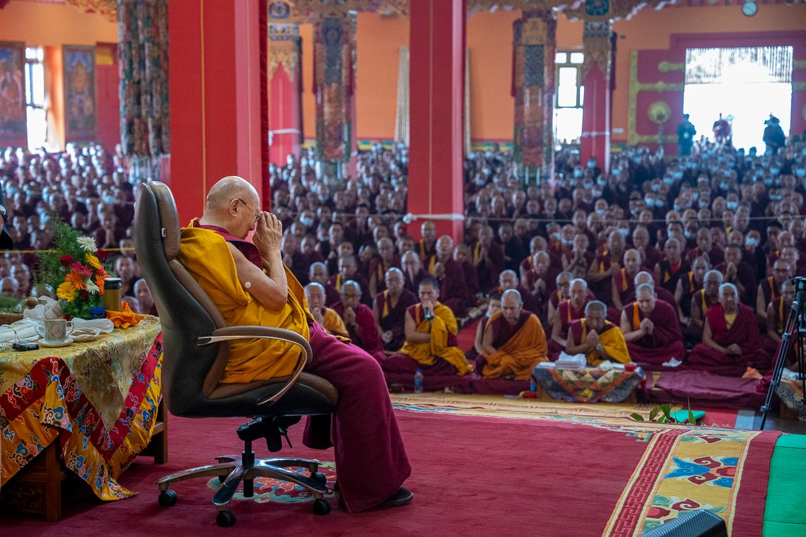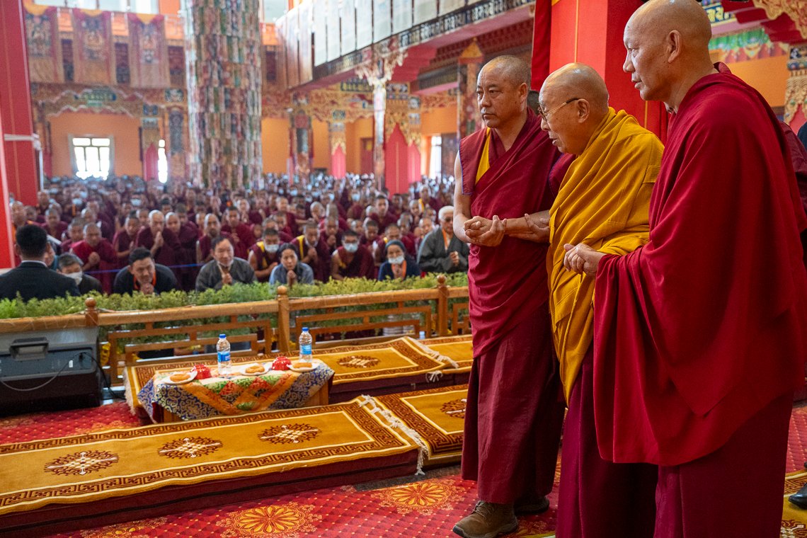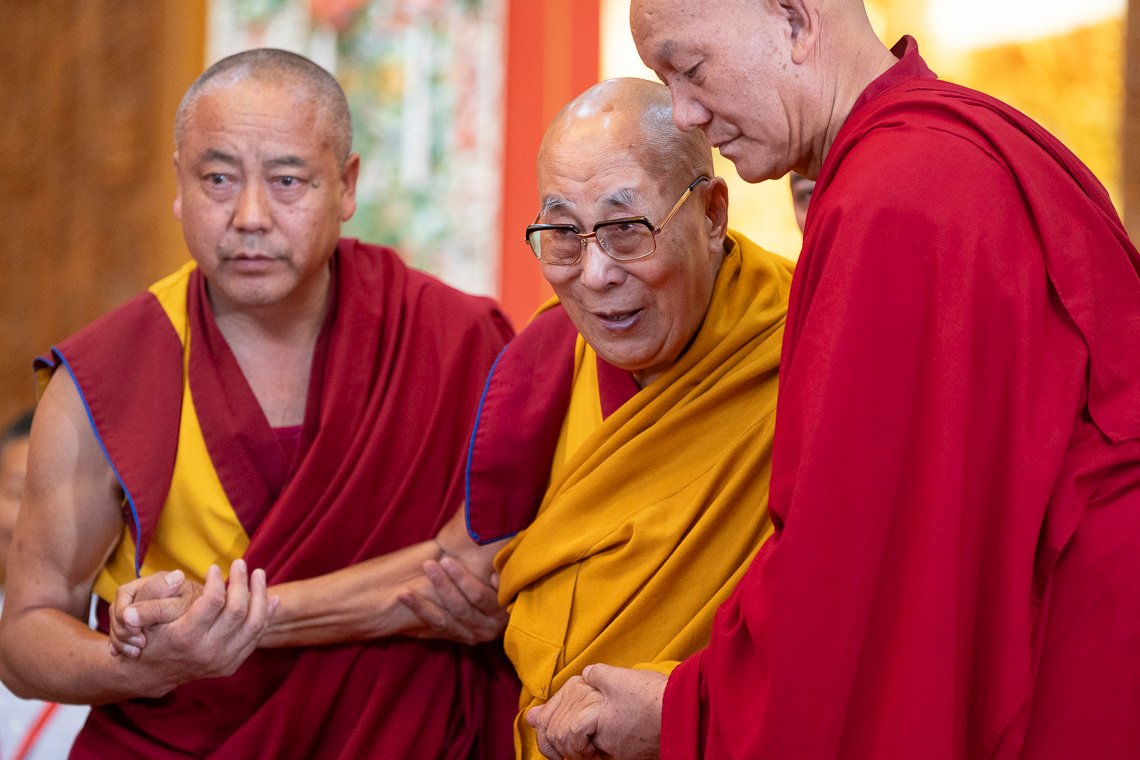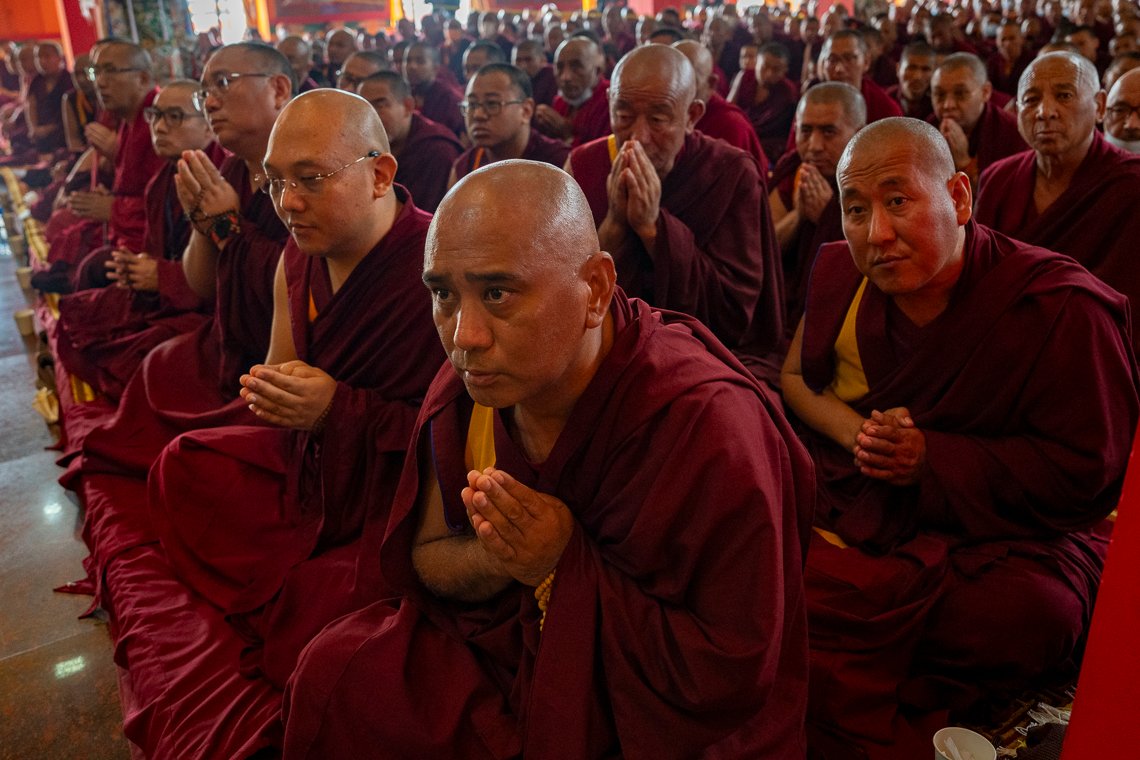По прибытии в храм Его Святейшество занял свое место напротив величественных позолоченных статуй Будды и Первого Далай-ламы, а также изображений предыдущего Панчена Ринпоче и его преемника Гендуна Чокьи Ньимы. Справа от Далай-ламы сели Шарпа Чодже Ринпоче, настоятели и бывшие настоятели монастырей. Рядом с ними расположились бывшие члены Центральной тибетской администрации и тибетского парламента в эмиграции.