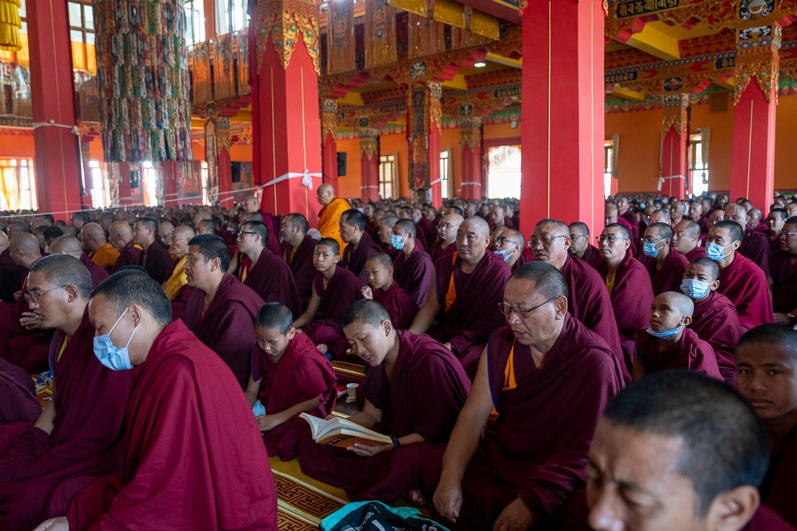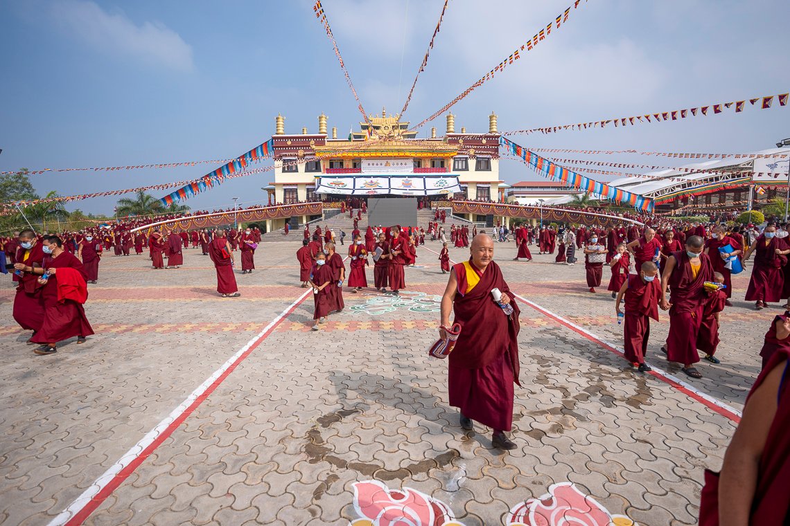 Люди из соседних тибетских поселений начали прибывать еще ранним утром и стали заходить на территорию монастыря с 6:15 утра. Монахи ровными рядами расположились в храме. В ожидании начала церемонии собравшиеся нараспев читали мантру Будды Шакьямуни.