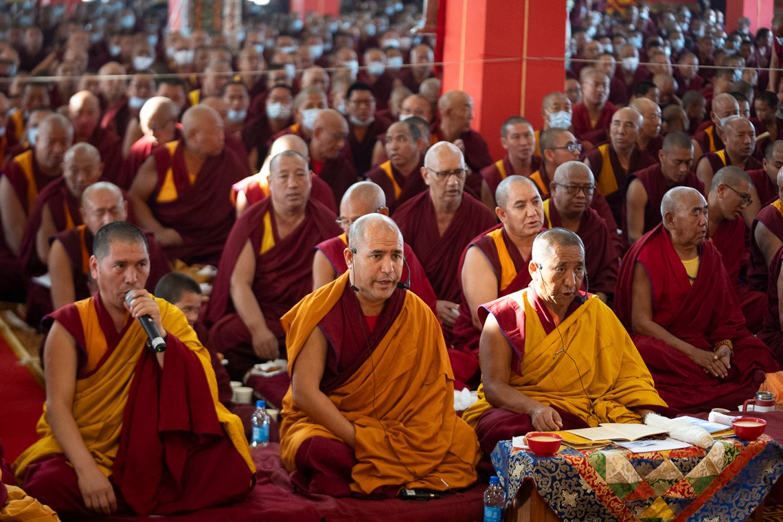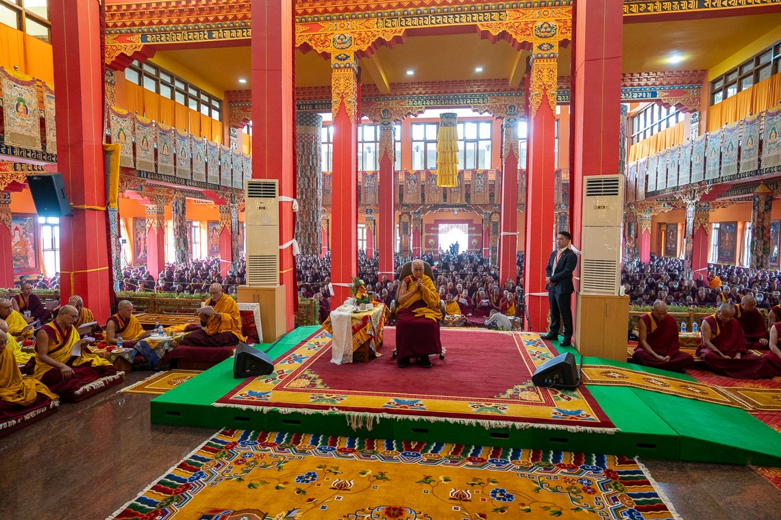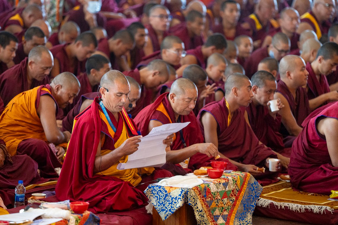 Наставник Таши Лхунпо по дисциплине объявил, что сегодня проходит молебен под руководством Его Святейшества Далай-ламы и других духовных учителей. Затем он огласил список пожертвований, совершенных в поддержку церемонии.